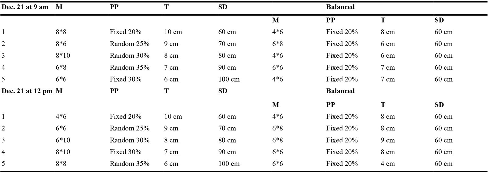 The matrix, thickness, and separation distance parameters were manually simulated due to their relatively small number of variables—9 for M and 7 for both T and SD. However, the perforation percentage involved a larger number of variables, as it was programmed to include both constant and random perforation, controlled by two number sliders. Consequently, Galapagos and "GhPython Script" components were used to detect the optimal solution, with an average iteration of 100 in each of the twelve durations.