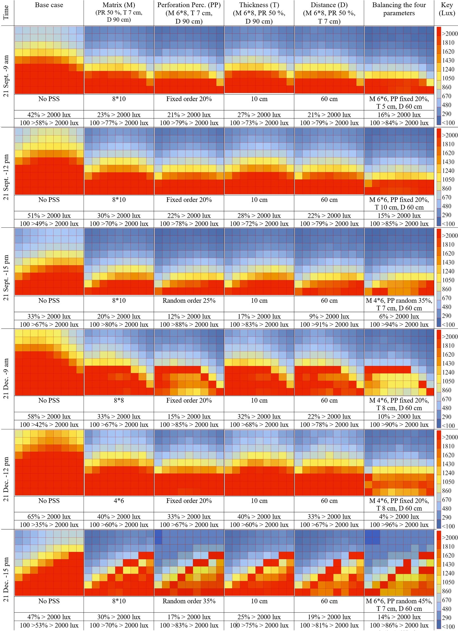 In brief, across the year, the balanced solution could significantly reduce the overlit areas and outperform the individual parameter solutions by reducing the overlit areas by up to 29% more than the PP and SD solutions and up to 36% more than the matrix and thickness solutions. Accordingly, the balanced solution had the highest impact in reducing high illuminance levels, followed by the PP solutions, then the SD solutions, with the matrix and thickness solutions having the least impact. The percentages of overlit areas of the six scenarios throughout the year are illustrated in Fig. 9.