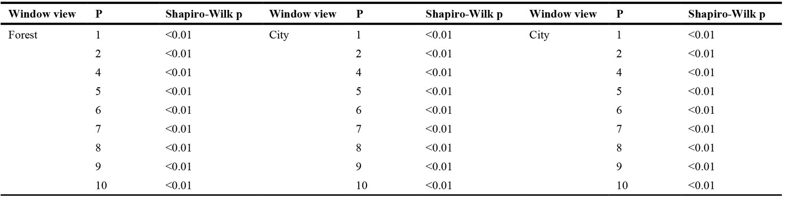 Before conducting the marginal means estimation analysis, a normality test was performed for each EEG measurement to ensure that the data or variables were normally distributed. Table 2 presents the results of the normality test for all participants, window orientations, and view types, indicating that all variables in all measurements were normally distributed (Shapiro-Wilk p < 0.05). Therefore, the research proceeded to the next stage of analysis.