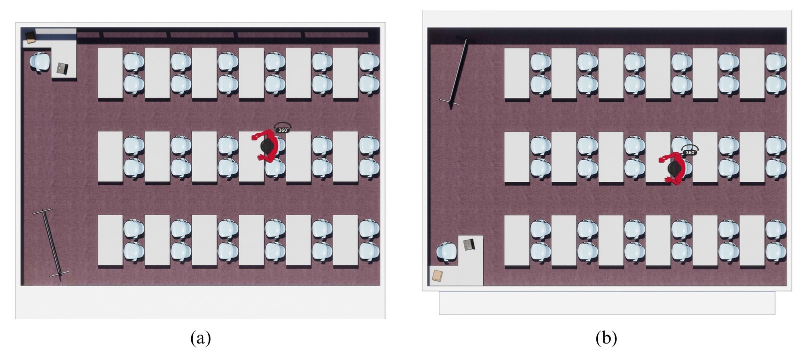 Fig. 2. Classroom furniture layout and seating position of the student/participant: (a) without shading, (b) with shading.