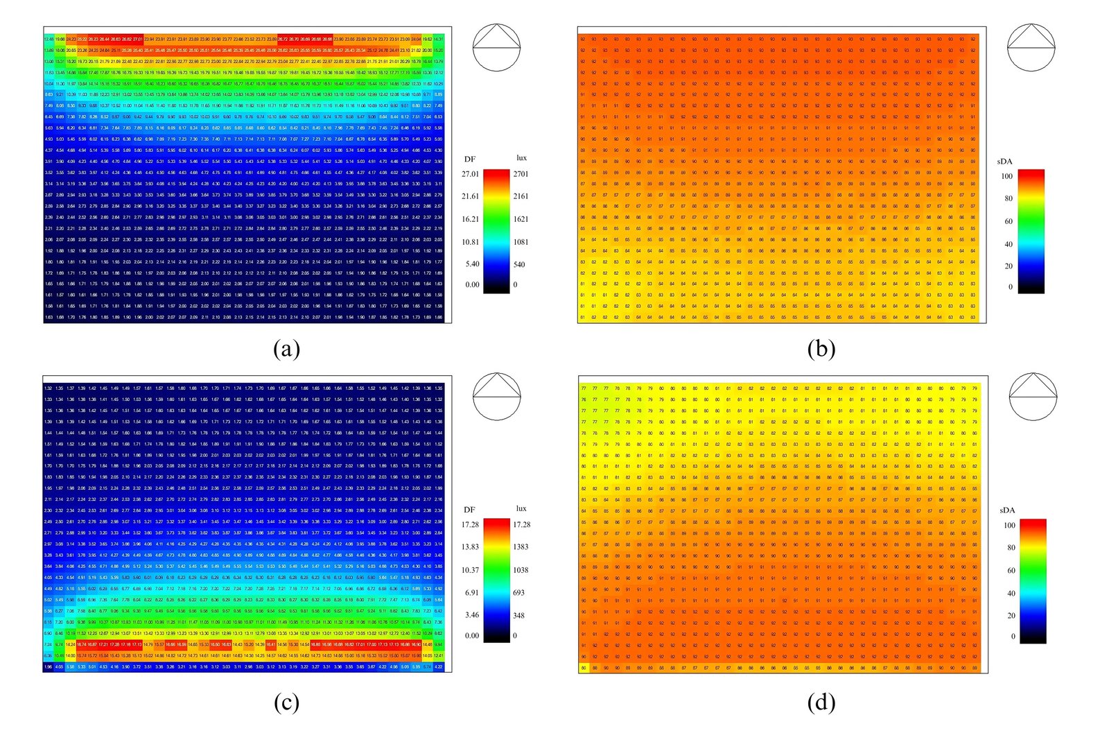 Fig. 4. (a) Simulation of daylight factor and illuminance of a classroom with right-side window, (b) Simulation of daylight autonomy of a classroom with right-side window, (c) Simulation of daylight factor and illuminance of a classroom with left-side window, (d) Simulation of daylight autonomy of a classroom with left-side window.