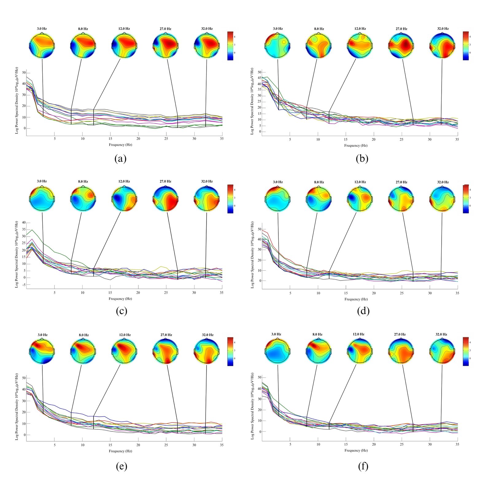 Fig. 5. Topographical maps of Participant 1’s brain responses to left-side windows with forest (a), city (c), and park (e) views, and right-side windows with forest (b), city (d), and park (f) views.