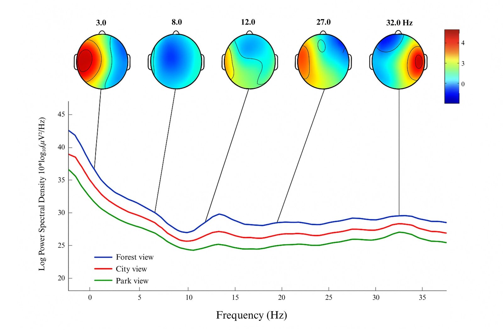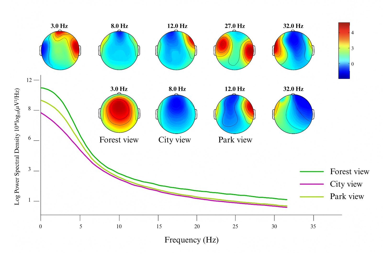 Forest views elicited the most favorable EEG responses, marked by increased Alpha and Theta activity in the posterior brain regions, reduced high-frequency (Beta/Gamma) activation in the frontal areas, and more symmetrical topographical patterns. These neural signatures are typically linked to relaxed alertness, internalized attention, and visual rest, reinforcing the forest view as the most restorative environment. The results align with previous research showing that dense greenery promotes mental restoration and attentional recovery through soft, passive fascination, a key feature of biophilic environments [61–64].