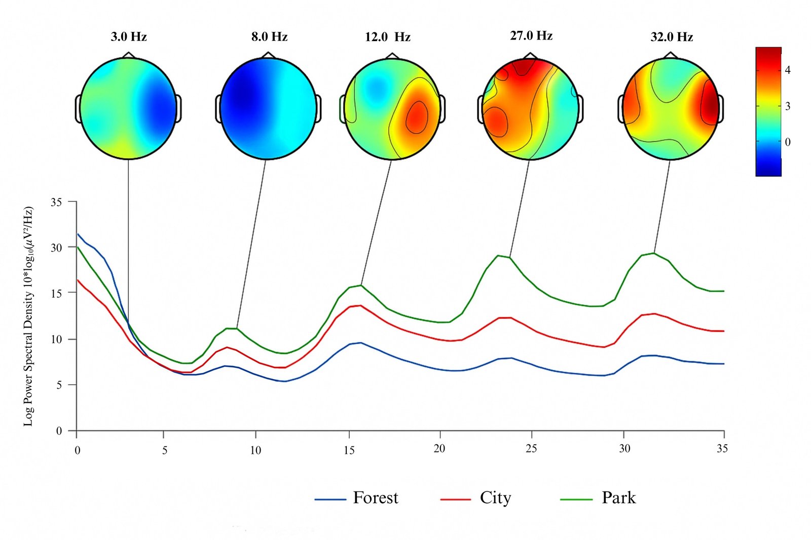 EEG studies comparing natural and urban environments reveal that natural settings enhance cognitive performance, attention, and meditative states [30] supporting theories that nature facilitates attentional restoration by reducing overstimulation. These effects are reflected in distinct neural signatures. Alpha waves across the cortex are linked to relaxation and inward-focused attention, while Beta and Gamma activity in the frontal cortex indicate focused attention. Frontal asymmetry also reflects emotional valence, with greater left frontal activation corresponding to positive emotions and approach motivation, and greater right activation associated with negative affect such as frustration, anxiety, or withdrawal. Arousal is typically marked by increased high-frequency activity in the posterior cortex, and meditative states may involve Theta activity in the frontal region.