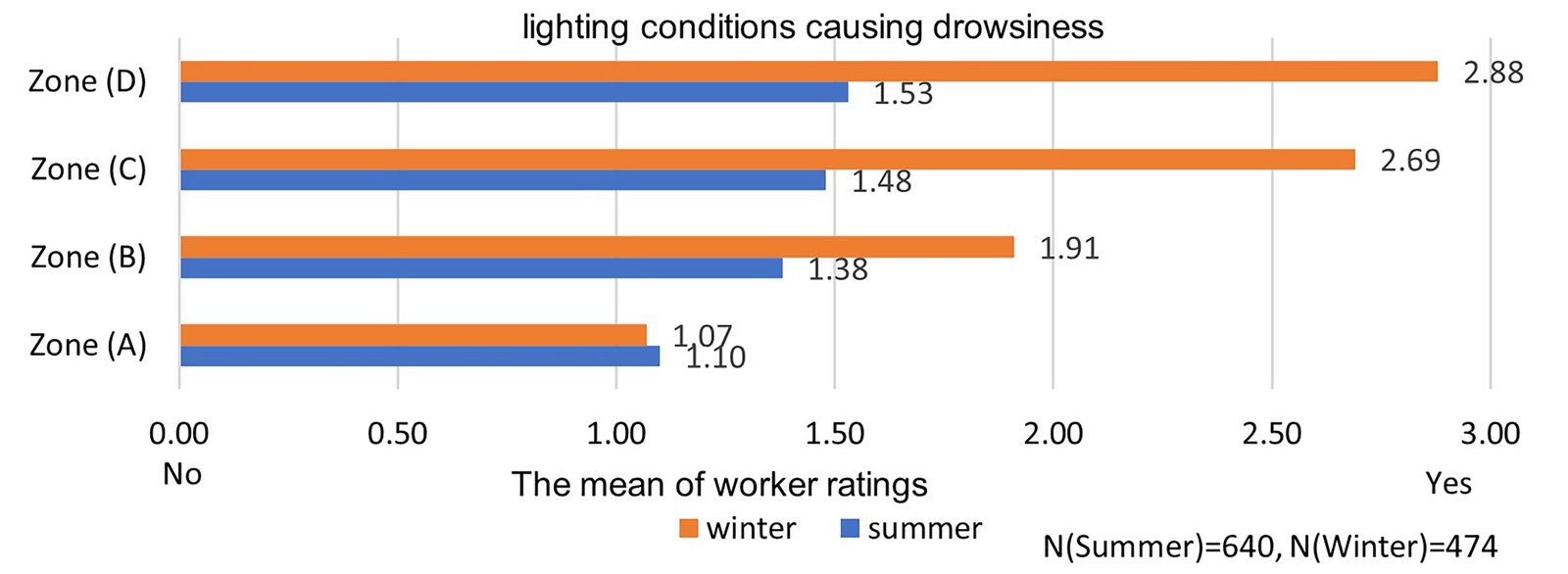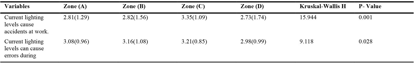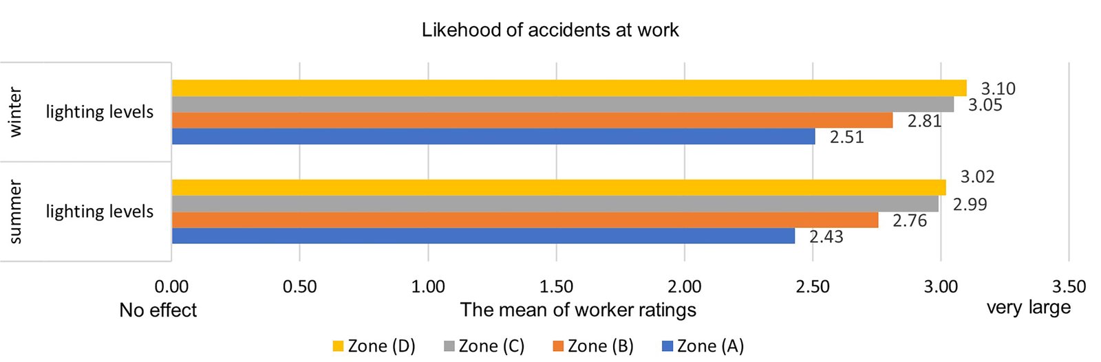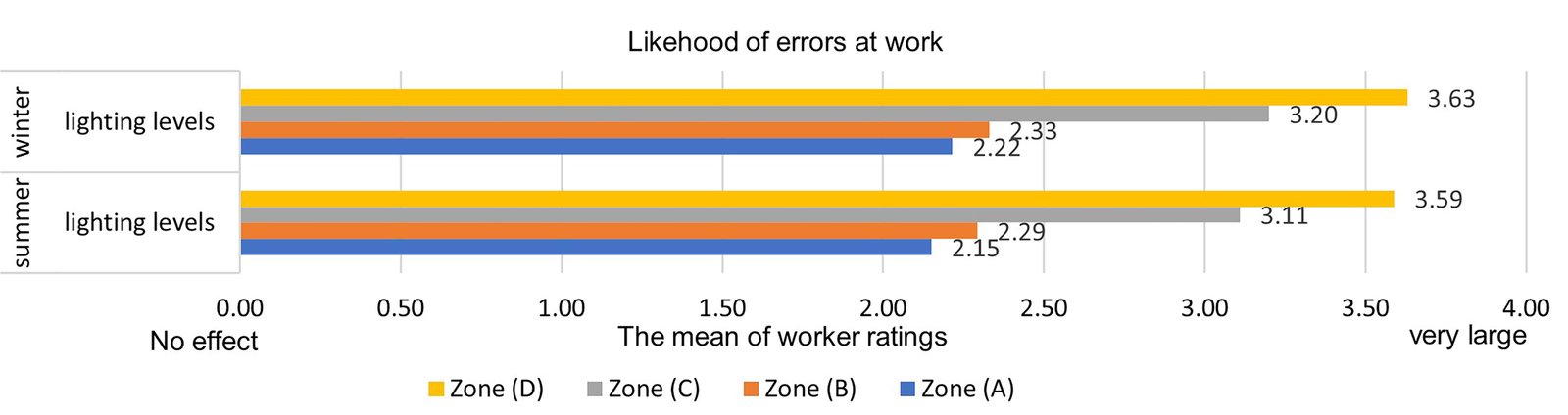 This was due to Zone D (artificial lighting) recording negative ratings of the likelihood of work errors compared to other lighting zones. Statistical differences were also found between participants' ratings on the likelihood of accidents due to lighting in Zone A (daylight lighting) and Zone C (mixed lighting).