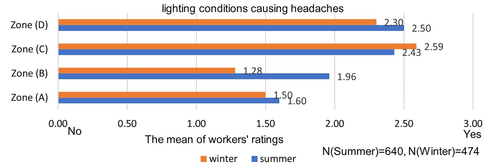 The results showed that Zone D (artificial lighting, Eh avg = 140 ± 120 lux) recorded the highest votes of experiencing headache in winter (61.6%) and summer (58.7%), compared to Zone A featuring natural daylighting (Eh avg = 498 ± 225 lux in winter, 572 ± 218 lux in summer), which was deemed the lowest headache rates (39.4% in winter, 32.5% in summer). Mixed lighting conditions in zones B and C also showed a high number of workers reporting headaches, (see Table 8).