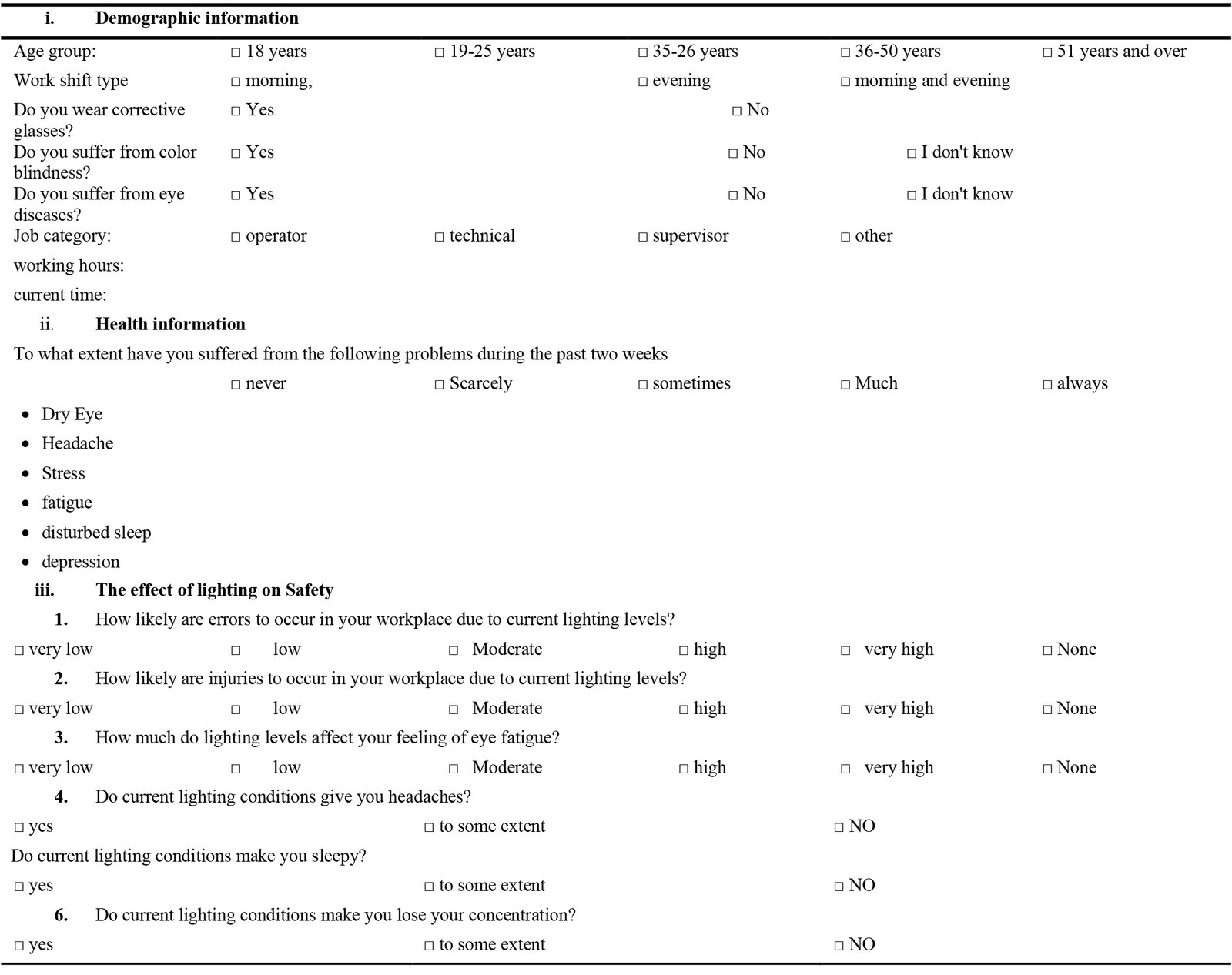 The design of the questionnaire was based on workers' self-assessment of the impact of indoor lighting on their health and operational safety at work. The original questionnaire was divided into 24 questions, exploring visual and non-visual responses to light. This research presents a section of the questionnaire focused on health and safety. Nine questions (listed in Table 2) were used after the demographic questions, based on workers' self-assessment of the likelihood of errors and injuries at work, or experiencing eye fatigue, headaches, drowsiness, and loss of concentration. The questionnaire questions were derived from previous studies on health and operational safety [1,29,43] and initially developed in English and subsequently translated into Arabic by a professional translator. To ensure accuracy, the translation was reviewed and then back translated into English by a second translator.