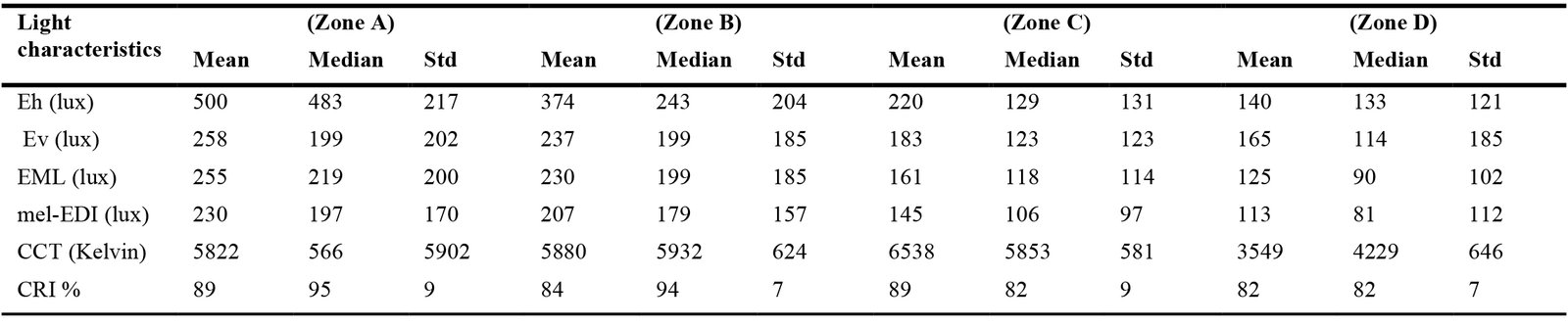 Table 4. The mean, median and standard deviation (Std) of lighting measurements in the six case studies.