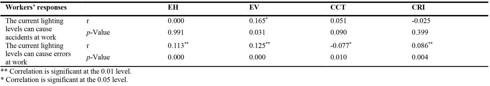 Table 6. Correlation between workers' opinions on the effect of lighting on safety, and EH, EV, CCT and CRI.