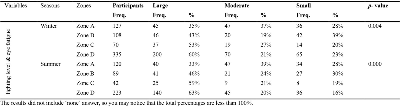 To study the effect of seasons on workers’ eye fatigue ratings due to lighting conditions, the Croxall-Wallis test was conducted to determine differences between workers’ ratings across summer and winter. The tests did not yield statistically significant differences between the two seasons. The same test was then conducted for worker groups in each of the four zones, followed by the Mann-Whitney test for paired comparisons, which yielded statistically significant differences between worker groups in zones A, B, C, and D. The analysis detected significant differences (Δ = 0.214, P< 0.001) between workers’ perceptions of eye fatigue in zone A lit by natural lighting (Eh avg = 500±217), and zone D lit by artificial lighting (Eh avg= 140±120). This could suggest that low illuminance levels Eh avg = 140±120 to cause more eye fatigue compared to higher lighting levels. See Tables A5-A8, in the appendix.