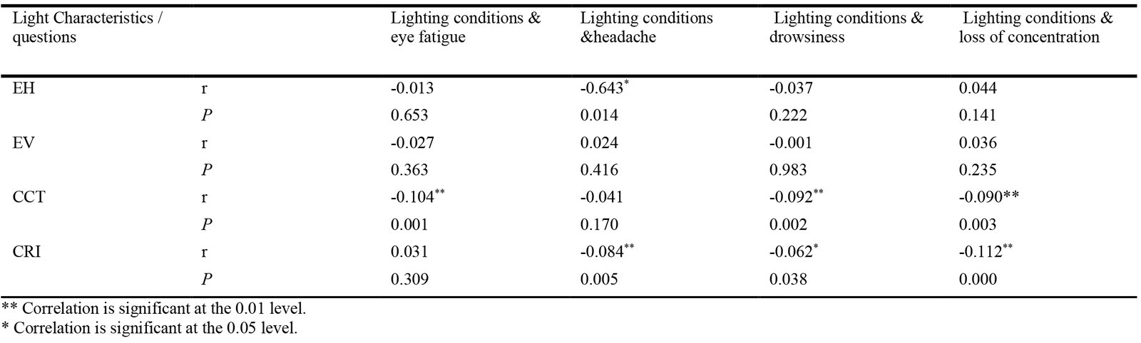 Table 9. Correlation between lighting characteristics and workers’ assessment of their feeling of eye fatigue, headache, drowsiness, and loss of concentration.