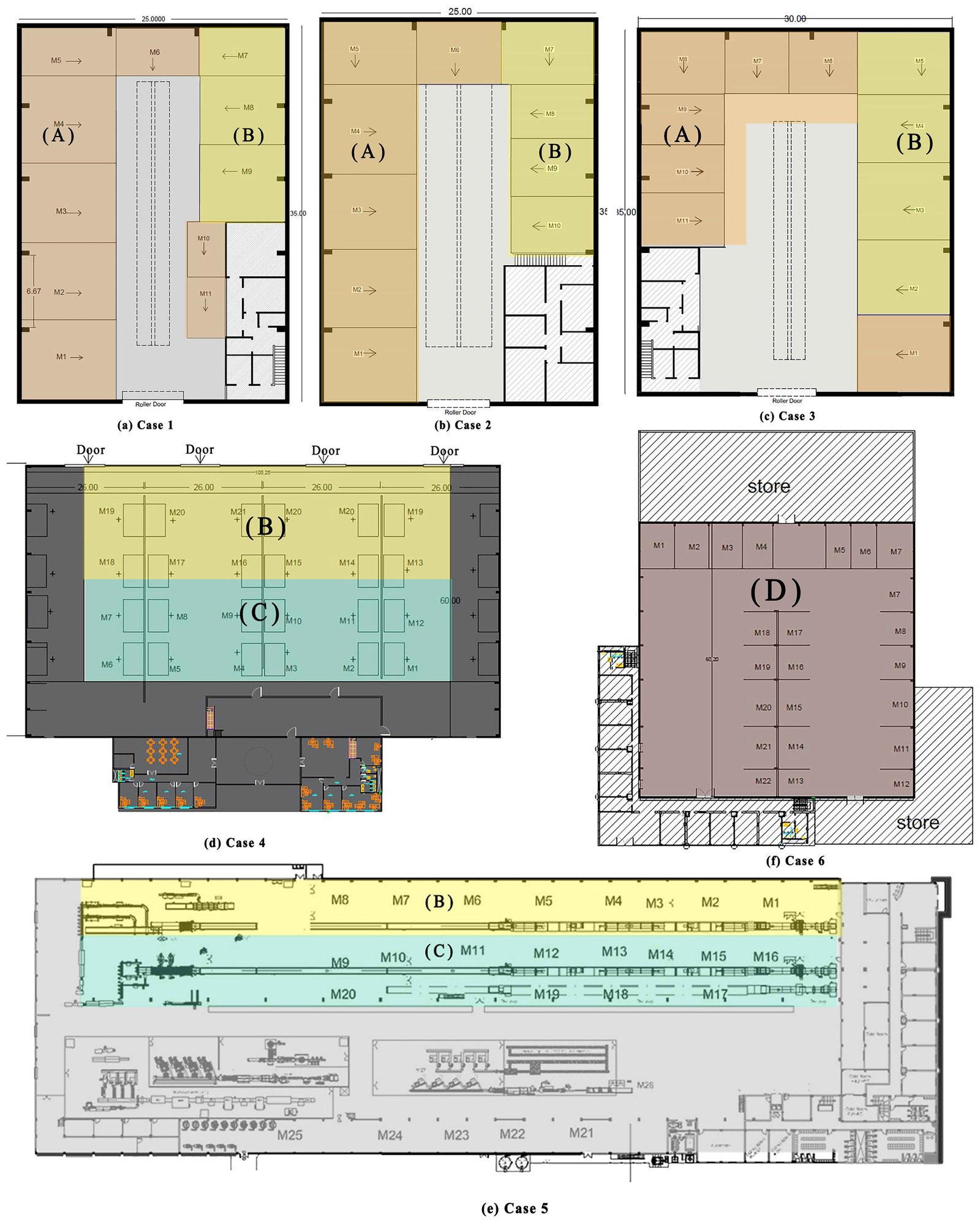including operators, assemblers, quality inspectors, and packaging workers. Fig. 7. shows the layout of workers within the production halls in the case studies. In the first three factories (cases 1–3), which specialize in the manufacture of metal chassis, workers are stationed around large U-shaped worktables, working in collaborative teams at various stages, such as bending, assembly, and inspection. It should be noted that some workers are not fixed in their positions, moving between tables to perform flexible tasks as needed.