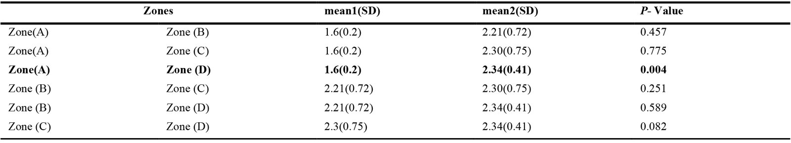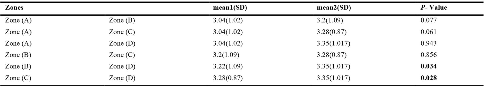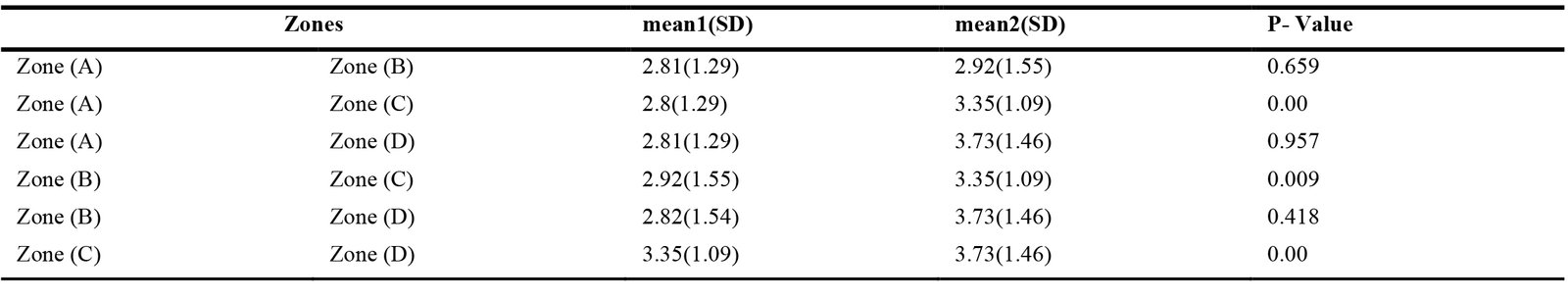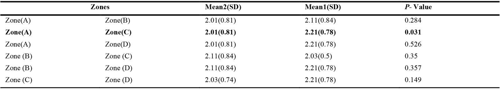 The results of the Kruskal-Wallis (Table A2) and Mann-Whitney tests (see Table A3 and Table A4) showed significant differences between participants’ ratings in the four lighting zones (P = 0.001). Pairwise comparisons revealed statistical differences between Zone B (mixed natural and artificial lighting) and Zone D (artificial lighting) (p = 0.034). Similarly, statistical differences were detected between participants’ ratings in Zone C (mixed natural and artificial lighting) and Zone D (p = 0.028).