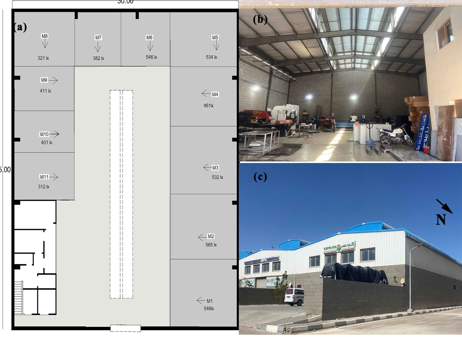 Fig. 6. Case study 6 (a) floor plan, (b) production hall internal view, and (c) external view.