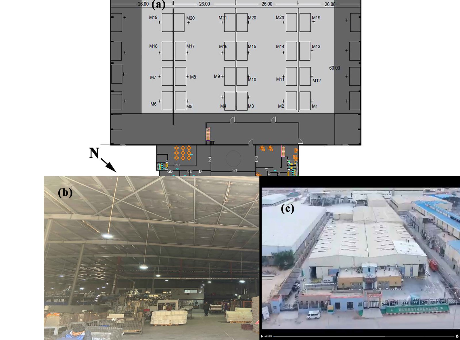 Fig. 1. Case study 1, (a) floor plan, (b) production hall internal view, and(c) external view.