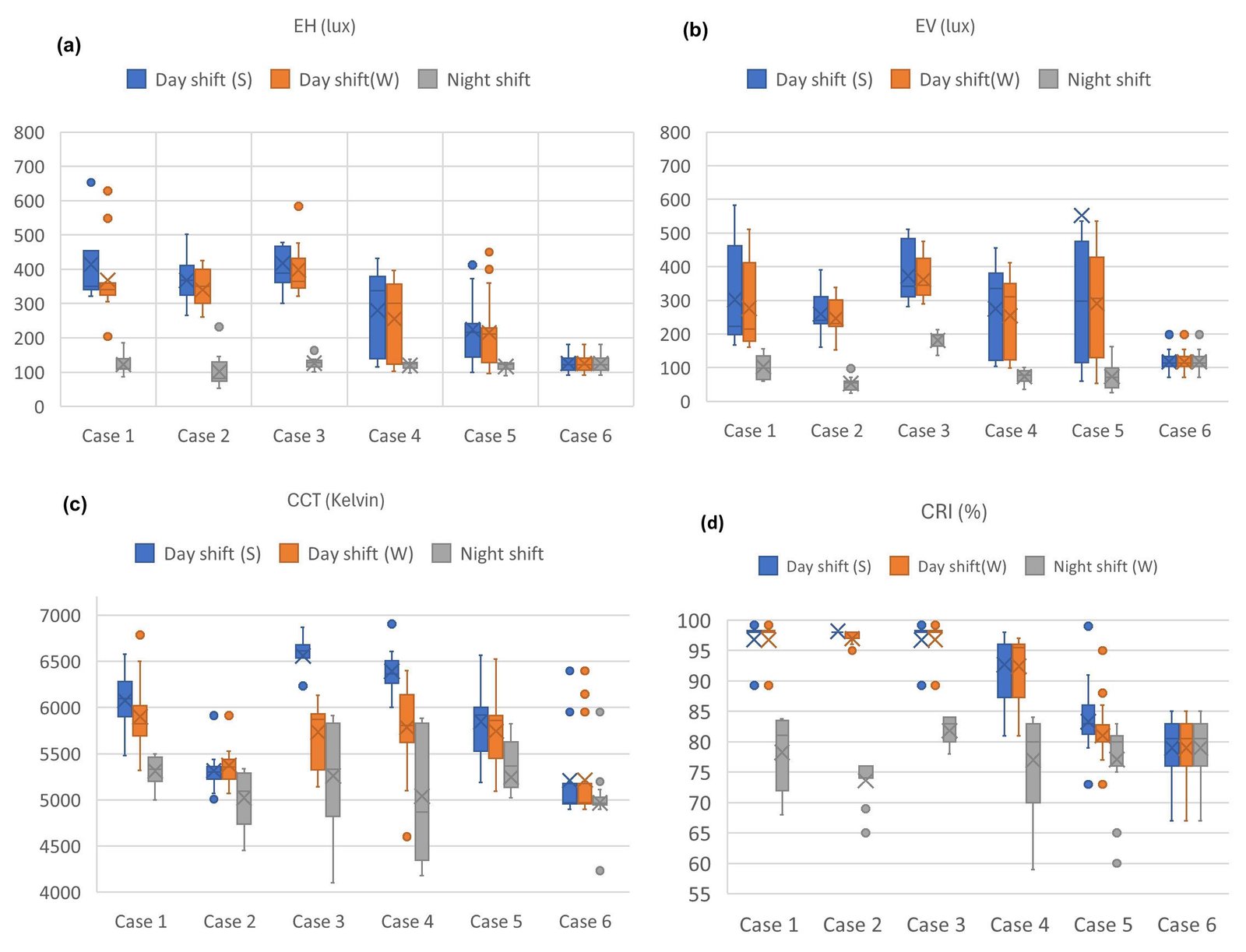 Figure 8, shows light measurements of EH, EV, EML, m-EDI, CCT, and CRI at each day and night shift in each case study. The differences in lighting conditions in the case studies are due to the percentage of natural light in each factory, size, and the orientation of the openings. Case studies 1, 2, and 3 receive direct natural light from the door openings towards the southwest and from the upper openings in the roof towards the southeast and northwest, see Table 1. Case 4 receives natural light only from the doors towards the southwest, while case 5 receives light from the southwest direction from the upper windows. Table 1 shows the mean values of EH, EV, EML, m-EDI, CCT, and CRI in summer and winter. Lighting performance within spaces in daytime reflects a complex lighting environment, which is one of the challenges of field studies in real-world settings, where it is difficult to control dynamic daylighting. Therefore, it was necessary to calculate the arithmetic mean and median of lighting data to provide a central estimate, while clarifying the standard deviation values to determine the extent of dispersion within each space (see Table 4). Following the collection of illuminance data, the lighting levels were divided into four light categories based on the values of the nearby lighting levels (EH) in the production halls, regardless of the type of lighting source. Natural light contribution percentages were estimated based on daytime and nighttime illumination values, and these percentages were used as a descriptive element for the identified zones.