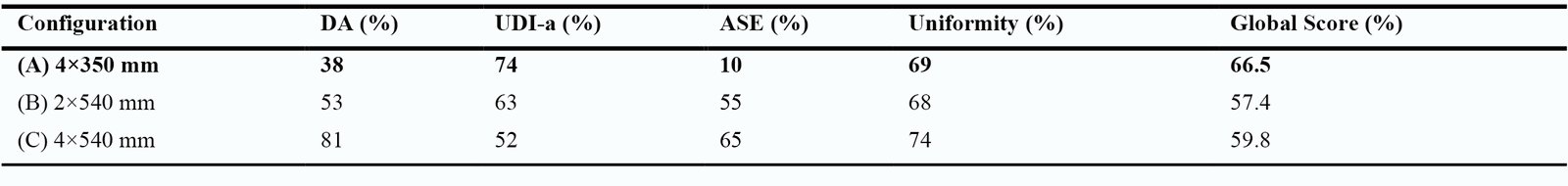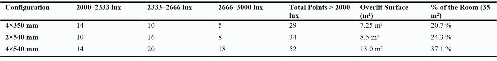 However, this quantitative performance does not necessarily guarantee optimal lighting quality. Indeed, the illuminance maps reveal that the 4×540 mm configuration exhibits zones of light saturation, which may lead to visual discomfort. Conversely, the 4×350 mm configuration offers a better balance between light quantity and uniformity.