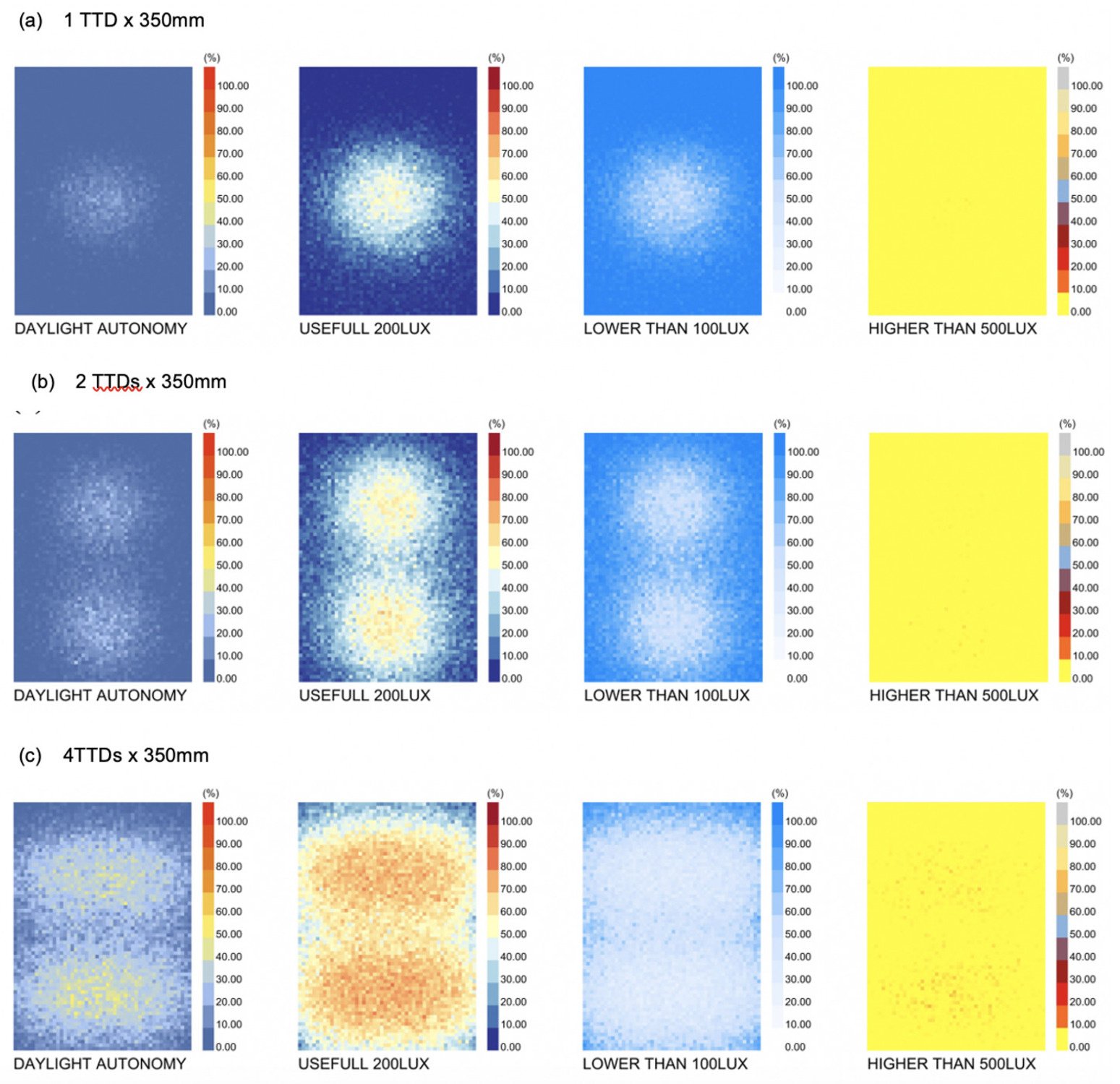 Consequently, increasing the diameter and number of TDDs improves DA but always increases the risk of over-illumination. The best compromise is the 4×350 mm configuration, which offers a satisfactory DA (38%), a high UDI-a (74%), and minimal over-illuminated zones.