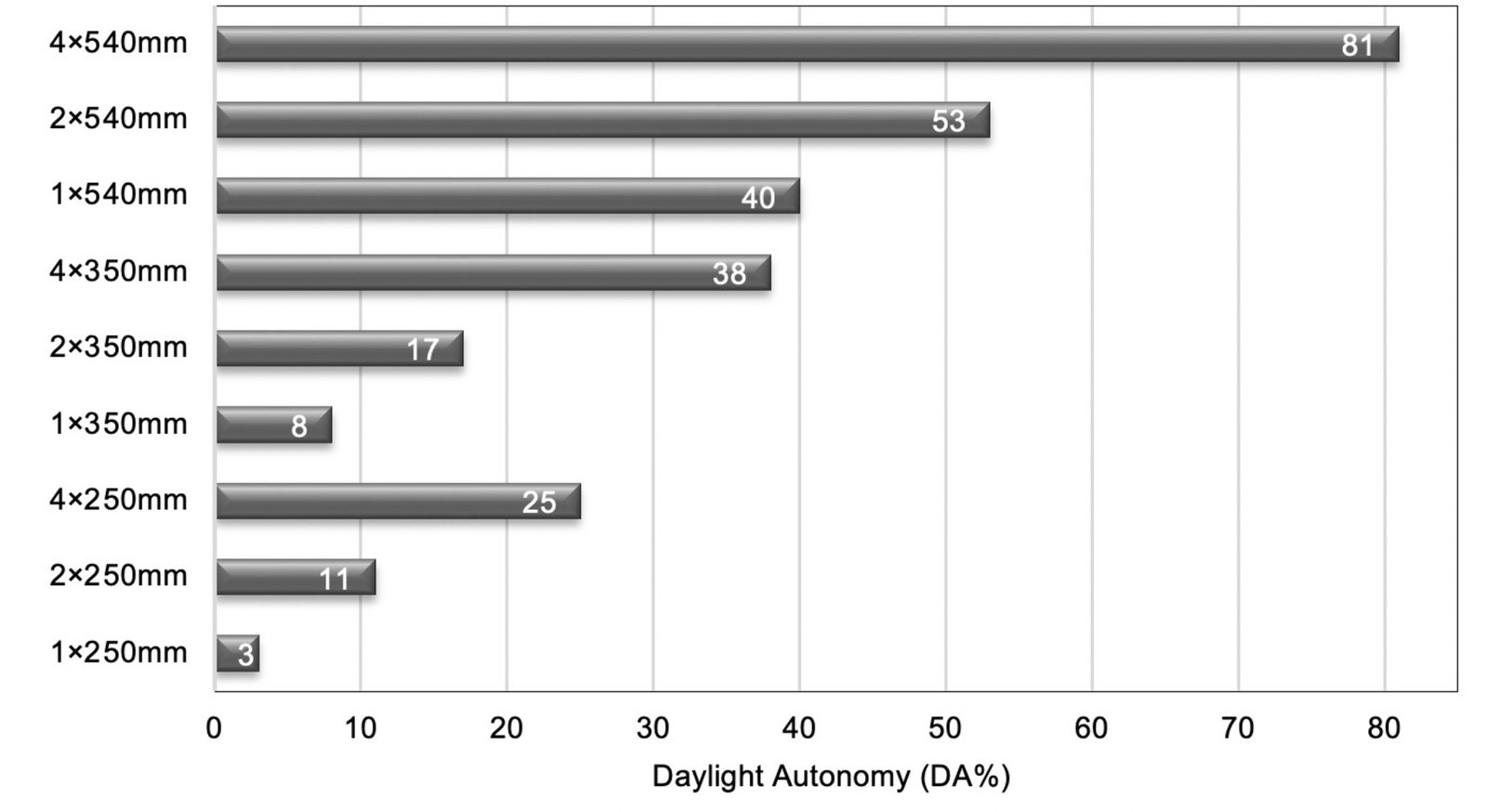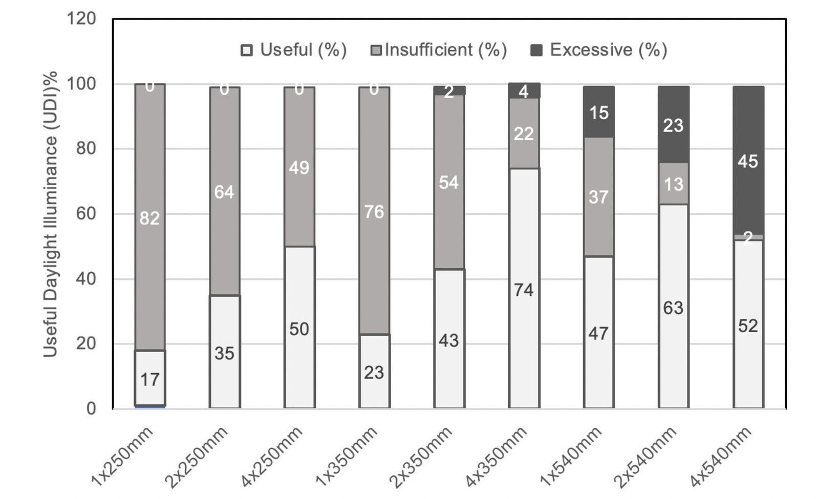 The 4×350 mm configurations demonstrate the best balance between daylight provision and comfort, with: