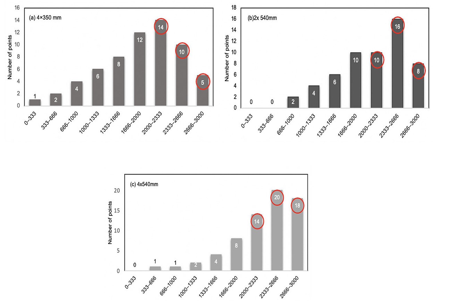 The 2×540 mm configuration (total area ≈ 0.46 m²) shows a higher efficiency (≈ 115% DA per m²) than the 4×350 mm configuration (≈ 0.38 m², or ≈ 99%).