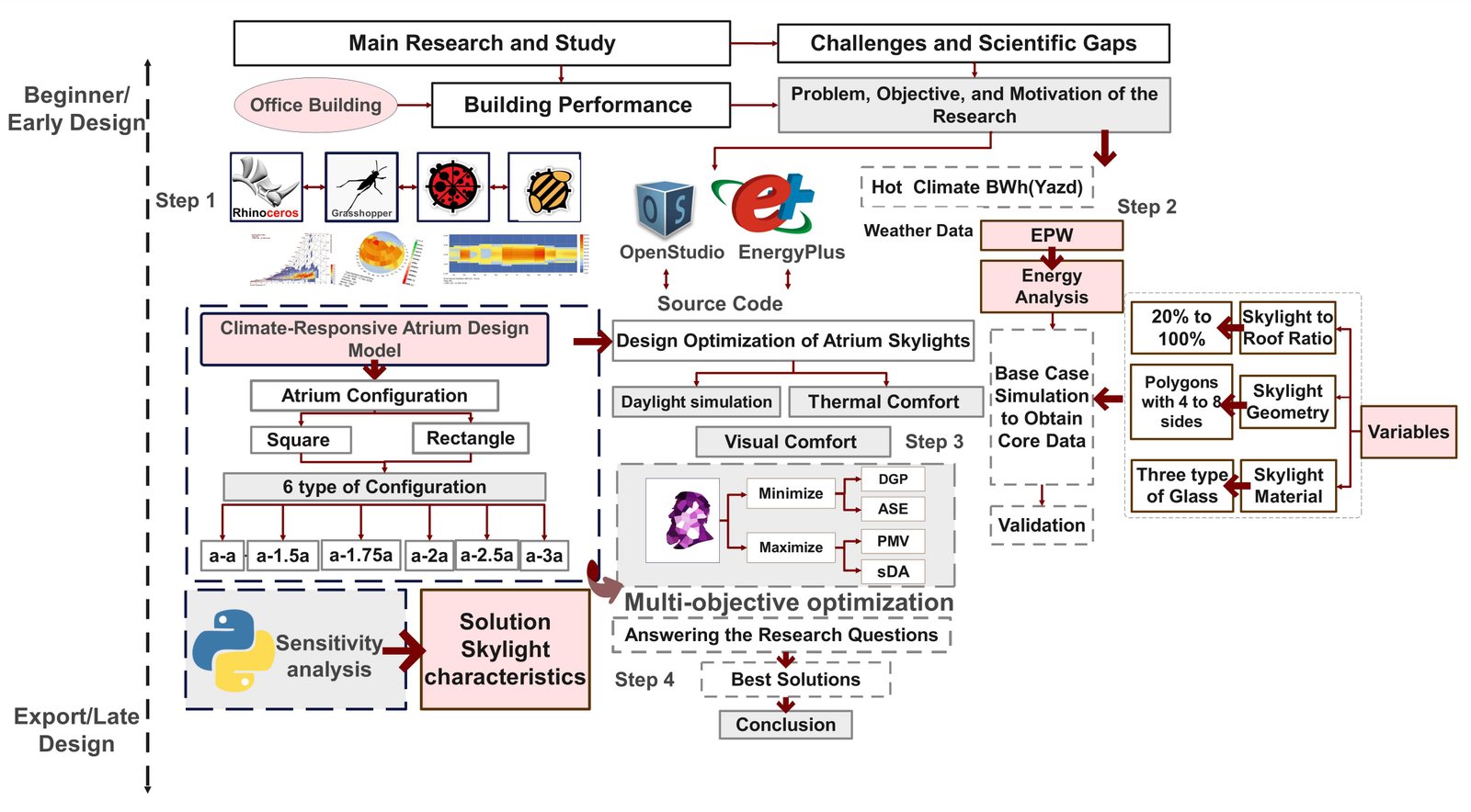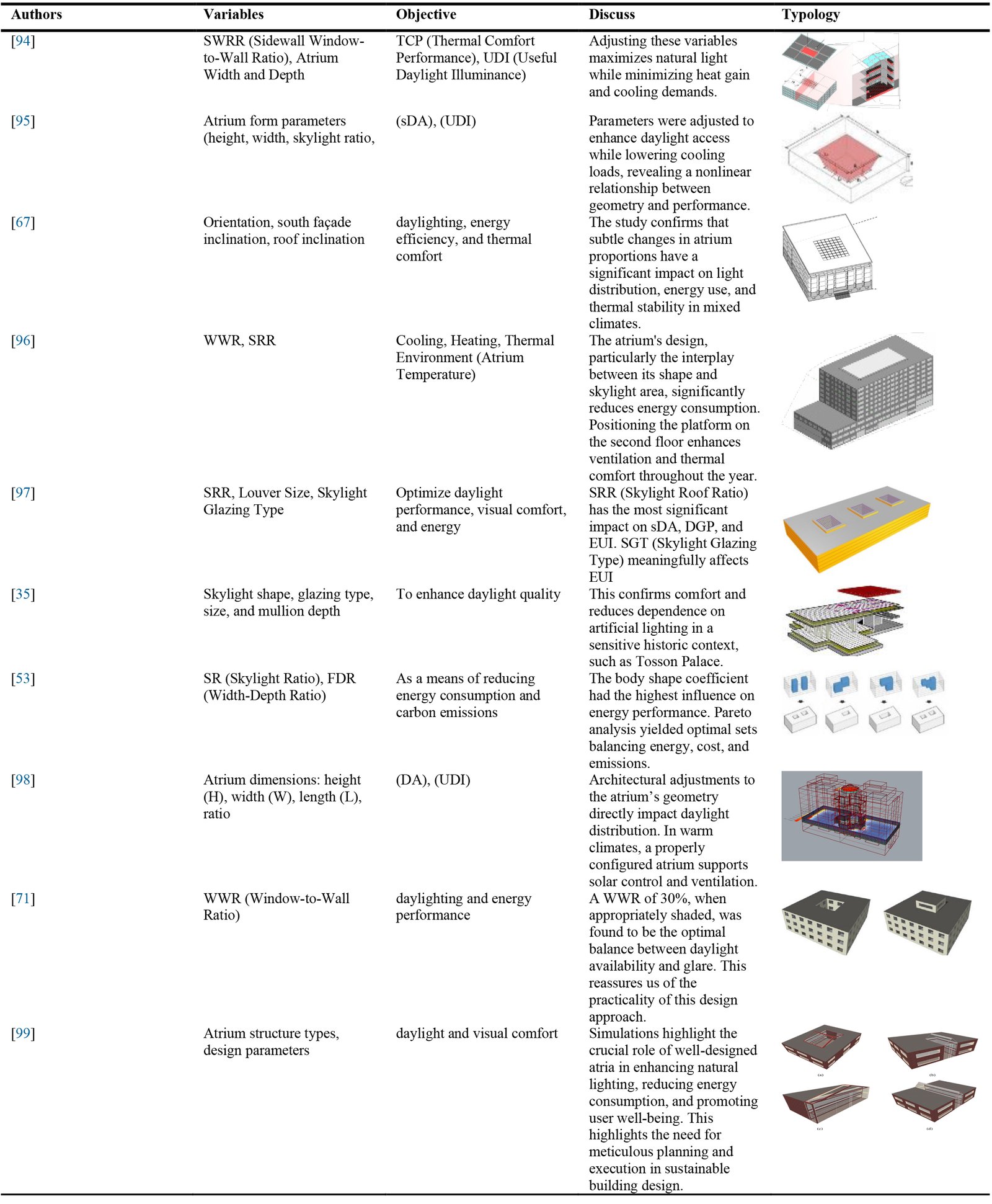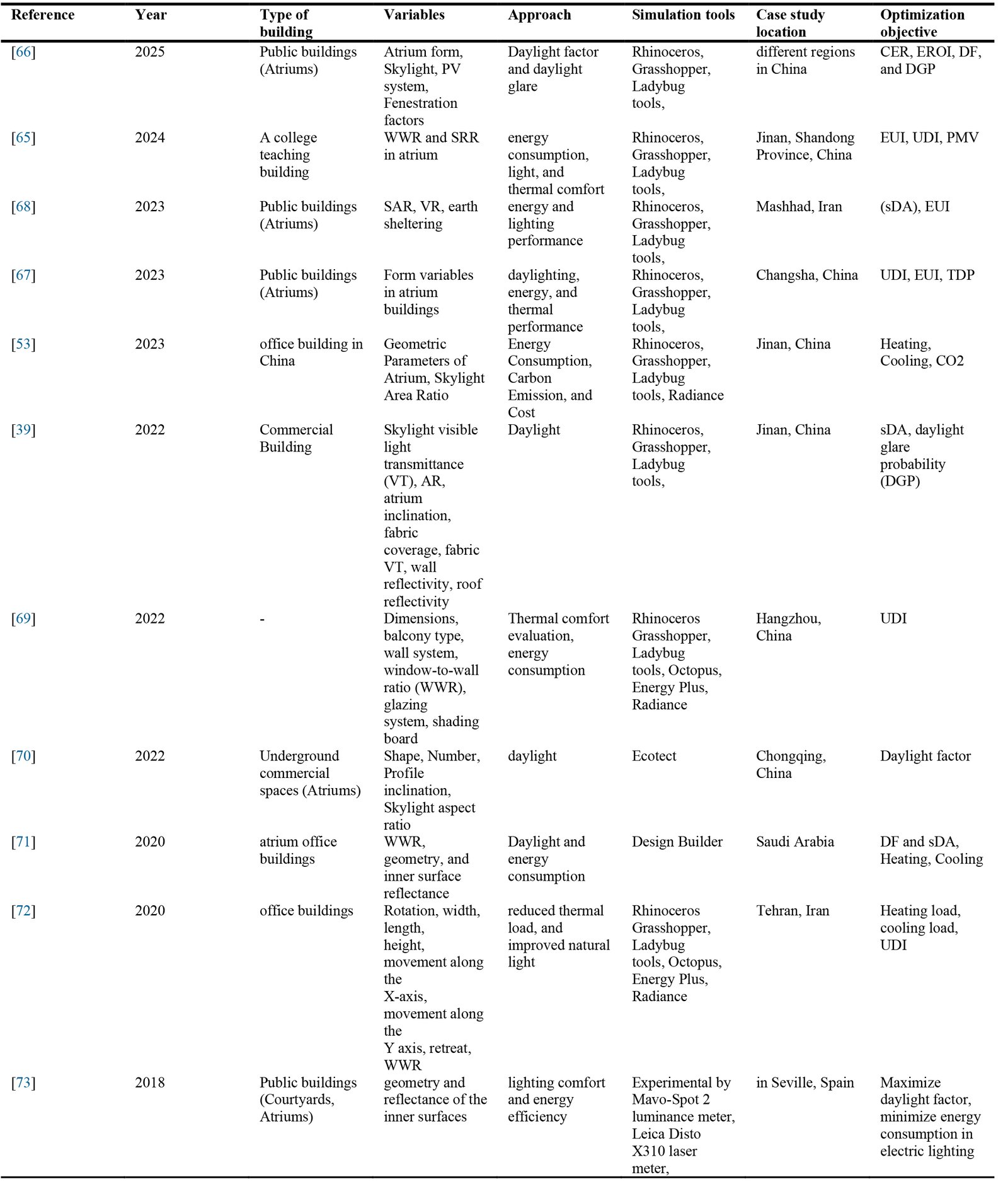 As Wang et al. [36] found, minimizing section aspect ratio (SAR) can reduce energy consumption in cold climates. A study was conducted by Fei Xu et al. and Peihao W. et al. [37], which examined how SAR, transmittivity, and absorption of membrane roofs were affected by the openings at the top of the roof. The thermal performance of Chinese buildings is affected by the top-to-bottom area ratio of their atria (TBAR) [38]. Studies have shown that increasing the span-to-height ratio (SHR) benefits the thermal environment and lowers air temperature. The study by Geng et al. [39], found that maximizing solar heat ratio (SHR) in atriums of office buildings reduces energy consumption within the typical range of 1 to 3. According to a review of atrium design studies, several key parameters are heavily considered, including the building's orientation, plane shape, area ratio, ventilation strategies, skylight configurations, and glazing components. Laouadi et al. [54] investigated the impact of various skylight types, glass types (double gray, double clear, and triple clear low e), and atrium plane shapes (three-sided and linear atria) on thermal and energy performance in cold climates. According to Dai et al. [55], four typologies were compared in terms of cooling and heating loads in nearby air-conditioned zones. Pan et al. [56] examined the effects of non-uniform thermal conditions in the atrium on HVAC load using EnergyPlus and CFD. According to Wang et al. [36], atriums with different section aspect ratios (SAR) and skylight area ratios (AR) perform differently in terms of energy performance. Using their research, they determined the optimal size of atriums to minimize annual energy consumption. Beyraghshamshir et al. [57] investigated the energy efficiency of courtyards and atriums in Iran, finding that converting a courtyard into an atrium resulted in reduced heating and lighting consumption. Further, a canopy can be lowered. Additionally, building shapes can be optimized for energy conservation. Using a genetic algorithm, Jin et al. [58], proposed an initial assessment method for thermal load characteristics using a free-form optimization method. According to Freewan's study, buildings sloped inward and outward in south and north directions showed differing energy use and thermal performance. To determine how vertical facades affect energy efficiency and thermal dynamics in buildings, these results were compared to those observed for horizontal facades [59,60]. The impact of skylights on offices has been investigated in a few studies. A study by Erica Cochran et al. examined the effects of dynamic shading on office skylights [61]. Various researchers, such as Karam et al., believe that skylights may help reduce load and energy consumption. Based on this hypothesis, designers will be able to successfully balance architectural environments at the initial design stage [62]. Recent research has emphasized the importance of visual comfort [63–64]. Zhengshu et al. [65] conducted an initial analysis using Rhino, Honeybee, and Ladybug software, followed by a multi-objective optimization that evaluated energy use, light comfort, and thermal comfort through indicators such as EUI, UDI, and PMV. Zhengshu Chen et al. [66] utilized a four-directional office atrium as the case study in their study. The research team developed a base model using Rhino and Grasshopper, which are parametric modeling software platforms. Ladybug and Honeybee, environmental simulation plugins, were employed to assess daylighting, energy consumption, and thermal comfort. The atrium featured a net height of 18 meters, a skylight-to-roof ratio of 0.6, and a flat roof. The skylight glazing exhibited a U-value of 2.0, a solar heat gain coefficient (SHGC) of 0.35, and a visible transmittance (VT) of 0.6. These tools and parameters facilitated the analysis of energy performance and environmental impact. Multi-objective optimization was applied to enhance energy efficiency, visual comfort, and thermal performance. Wei Xiao et al. [67] Within this research framework, sensitivity analysis is conducted using the Extended Fourier Amplitude Sensitivity Test (EFAST) method. Following the control of geometric parameters, parametric modeling is performed with Rhinoceros and the Grasshopper plug-in. The geometric model is then integrated with EnergyPlus and Radiance, two widely recognized simulation engines, through Ladybug Tools plug-ins. The optimization process is subsequently carried out using Octopus, a multi-objective optimization (MOO) plug-in, to determine optimal solutions. Yibing Xue et al. [39] use advanced design and simulation tools to optimize daylight quality in commercial atriums. They use digital modeling software, including Rhino and Grasshopper. They utilize environmental analysis tools, such as Ladybug and Honeybee, to simulate daylight and glare for each design parameter. These tools enable a thorough analysis of geometric factors, such as shape and size, as well as material properties, including surface type and reflectance. Table 1 shows a literature review of studies in this field.