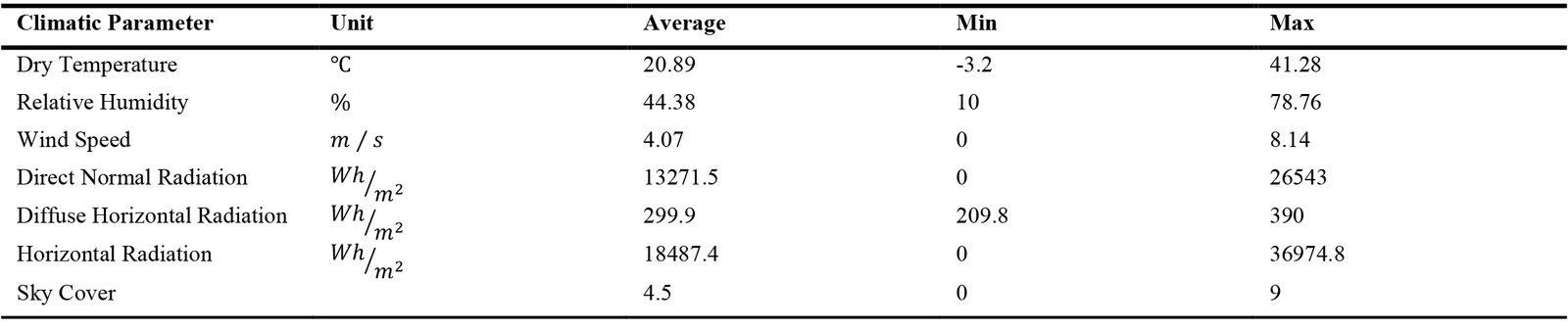 A variety of climatic systems influence Yazd throughout the year due to its location in the central part of Iran. Due to its geographic area within the global dry belt, it experiences cold winters and hot, dry summers. As with most desert regions, temperature fluctuations in Yazd are quite significant, even daily. Yazd station, for example, registers an absolute minimum temperature of -3.2°C, and an absolute maximum temperature of 41.28°C. The climate of this region is accurately depicted in Fig. 2, Which Shows the Location of Yazd, in Fig. 3, which presents Yazd's Climate Analysis by using direct normal radiation. The climate in this city is hot and arid, similar to that found in many parts of Iran. It has been reported that 98.2% of the country's area has climates like "Bwh" (35.98%), "BSk" (23.69%), "Csa" (17.03%), "BSh" (15.70%), and "BWk" (5.94%) [101]. This research aims to address daylight quality, thermal comfort, and visual comfort in hot and arid climates, which may also be helpful to others working in similar climates worldwide.