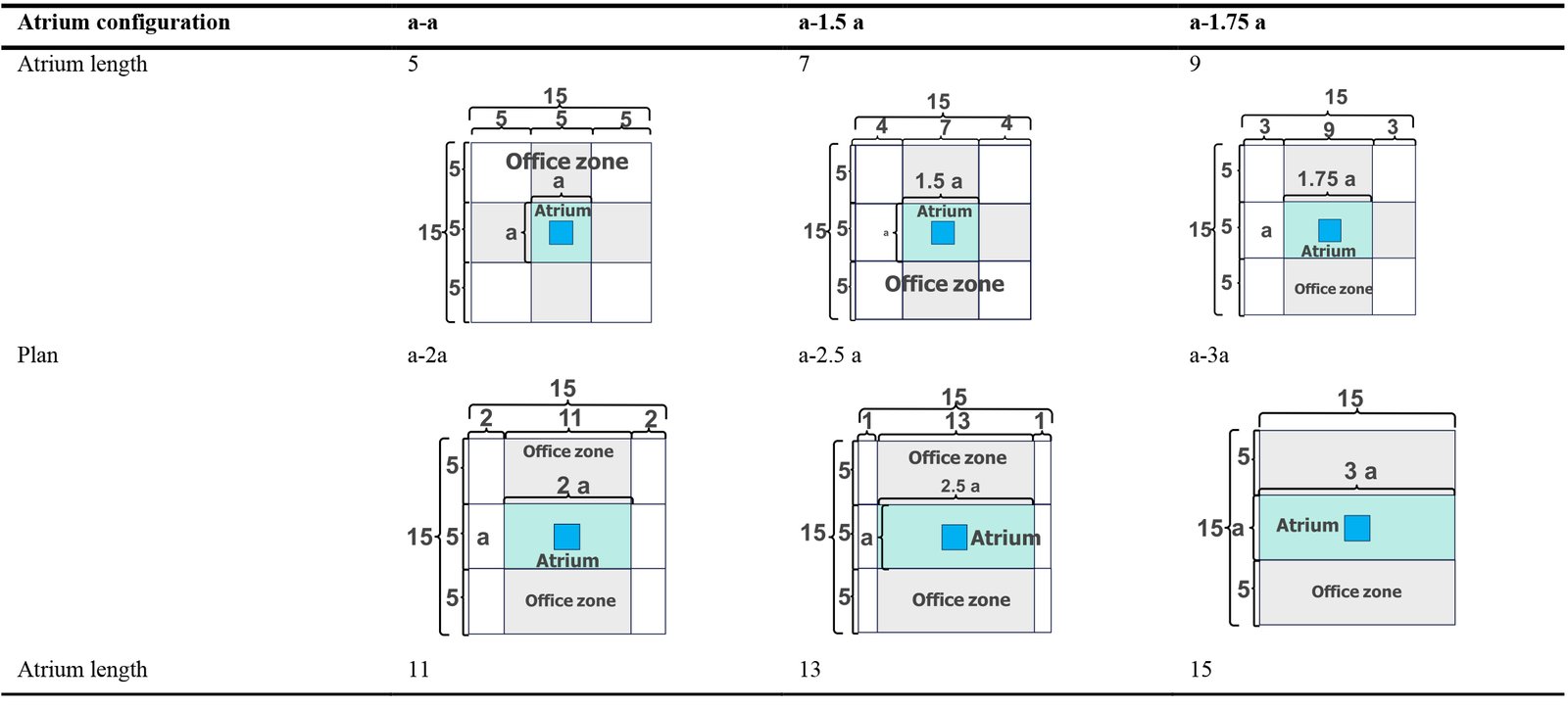 According to Table 8, the study was conducted on one floor of an office building, where the default room dimensions were 5 meters long, 5 meters wide, and 3 meters high. The atrium is assumed to be located slightly above the office space at the top of the building. Ceilings on each floor are 25 centimeters thick, and window frames in all rooms are 25 centimeters thick.