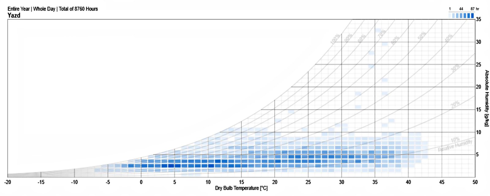 Table 6 shows the climate parameters in Yazd. also, Yazd experiences significant variations in thermal comfort throughout the year. In spring, around 598 hours (27.1% of the month) are comfortable. In summer, despite high temperatures, 578 hours (26.2%) offer some comfort. Winter also has 578 hours (26.2%) of comfort due to cooler temperatures.
