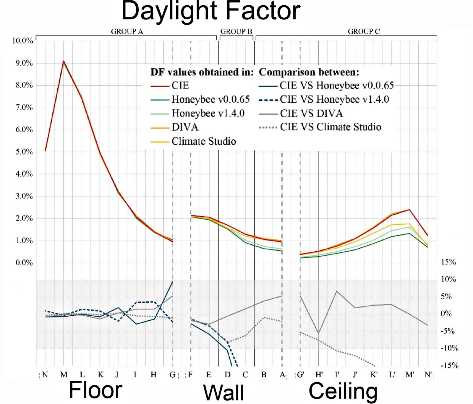 Fig. 8. Illustrates the assessment of the DF using various tools in the CIE Test Case for a 4-meter by 3-meter unglazed opening [103].