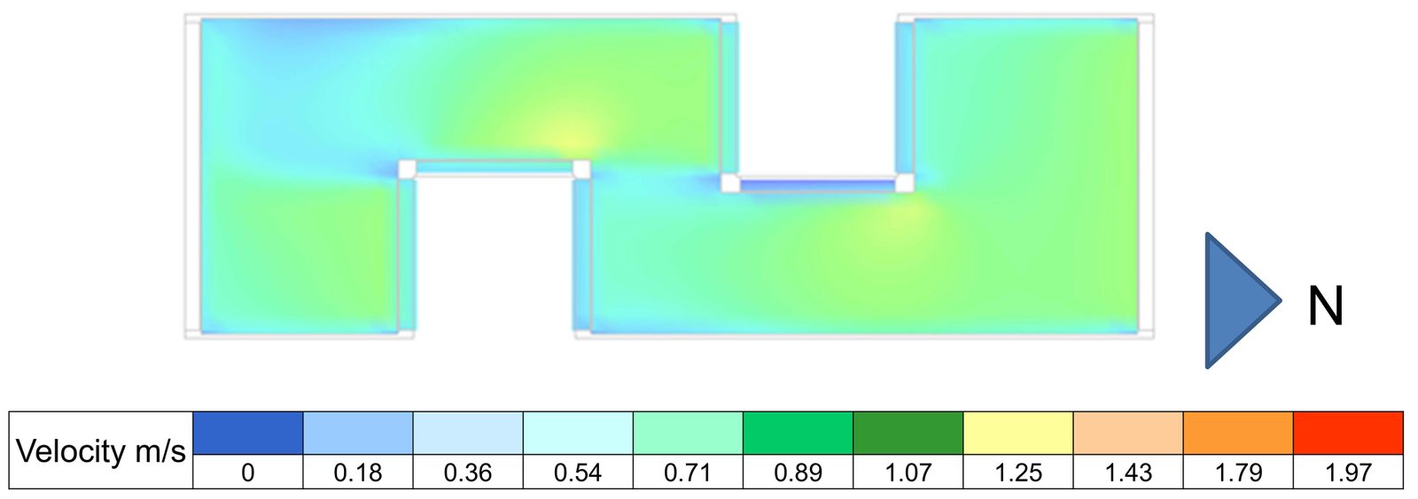 Fig. 12. Wind velocity filled contours pattern in top floor plan view on January 5th 9 am for wind direction from South East and wind speed of 1.23 m/s.