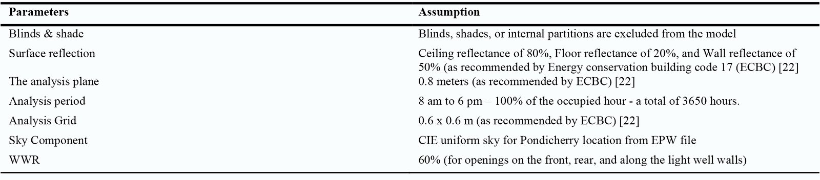 Several studies have examined the effectives of light well in improving indoor daylight availability. The geometry of light well including height, width, depth, and cross-sectional shape has been identified as a key determinant of their daylighting performance. For instance, Kristl and Krainer [1] analysed how geometric configurations influence illuminance levels using scale models and the daylight factor as a primary metric. Similarly, Amin et al. [7] introduced design modifications in light well profiles employing a wider upper and narrower lower section to improve daylight penetration in hot and dry climates, achieving better light distribution. Other influential variables identified in the literature include orientation, plan form, height and width of the light well [8-12]. In recent years, simulation-based studies have increasingly used dynamic daylight metrics such as Daylight Autonomy (DA) and Useful Daylight Illuminance (UDI) to provide more accurate performance assessments under real climate conditions. For instance, Ahadi et al. [13] investigated square-shaped light wells of varying sizes and orientations using DA as a performance criterion, highlighting the advantages of non-rectilinear configurations in deep-plan layouts.