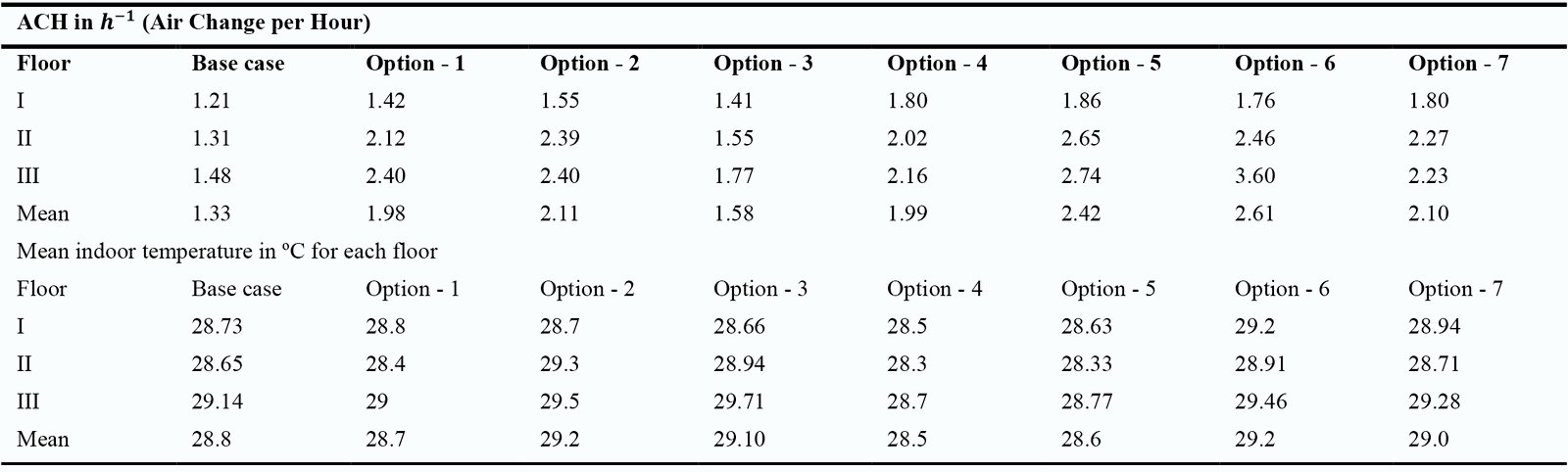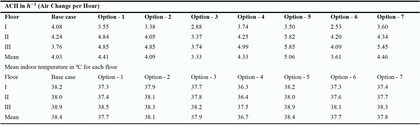 bedrooms 2-4 for a residential use building [22]. The mean indoor temperature for each floor was recorded from the Energy-plus results. The seven options selected from the daylighting analysis were compared with mean ACH and mean indoor temperature for all the habitable floors of the options without internal partitions and rooms. The results are listed for both the analysis daytime hour in Tables 5 and 6.