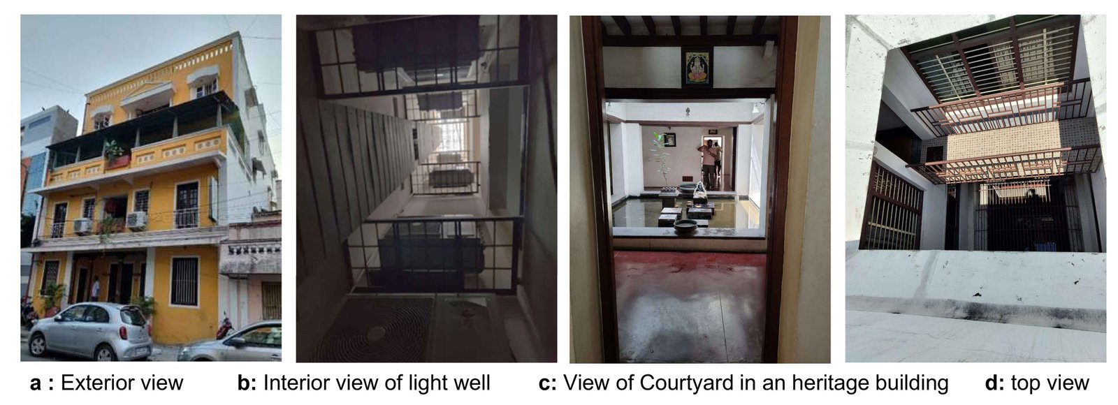 The increasing population in the heritage areas of historic cities, coupled with the high value of urban land, has necessitated the development of high-rise, deep-plan, and compact buildings. A deep-plan building is characterized by a floor depth that significantly surpasses its width, thereby complicating the achievement of a high skin-to-volume ratio that facilitates the penetration of daylight and natural ventilation into most interior spaces [1]. To address this challenge, architects frequently incorporate light wells—vertical voids or atria within buildings that serve as passive systems for natural lighting and ventilation [2-5]. This study focuses on deep-plan multi-storey residential buildings situated within heritage zones, with the objective of evaluating the performance of light wells in achieving indoor comfort and deriving the volumetric ratio of the light well to the total building volume under hot and humid climatic in dense urban context. The key design parameters, such as size, location, orientation, window dimensions, and number of light wells required, remain inadequately defined for this context. Consequently, this study investigates the parameters essential for designing efficient light wells in deep-plan buildings, with the aim of informing a potential regulatory framework in volumetric ratio for heritage areas in Pondicherry. This study was confined to a single representative building used as a base case for simulation and analysis, rather than encompassing the entire neighbourhood context. The findings provide indicative design parameters that offer preliminary insights, necessitating further validation across multiple building types and urban settings.