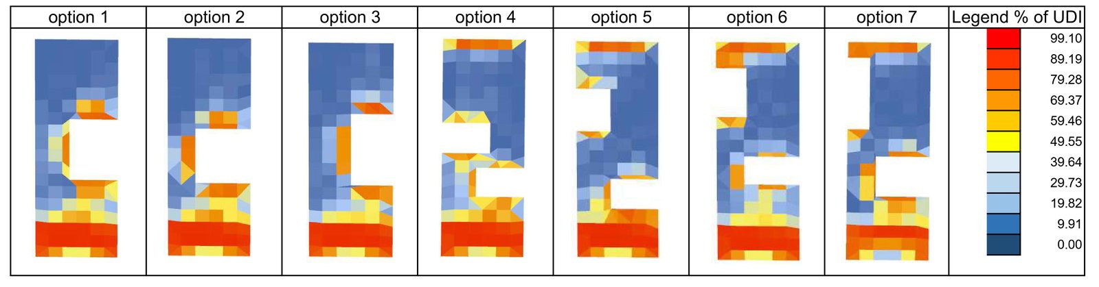 Initially, a Galapagos generative for the location of a fixed size of light well (options 1,2,4,5 and 6) was conducted, followed by generative solutions for random size (options 3 and 7), location, and building orientation, as shown in Table 3. After multiple Galapagos runs, the results were filtered for floor areas less than 90 m² and mean UDI exceeding 45%, in accordance with the ECBC 17 criteria [21] of the floor area. The image of the heat map of the ground floor for all the selected options in Fig. 7 and the grasshopper script in Fig. 6. The Options selected for UDI were more than 45%, as shown in Table 3, option no 1-3 were with a single light well, and no 4-7 were with double light wells.