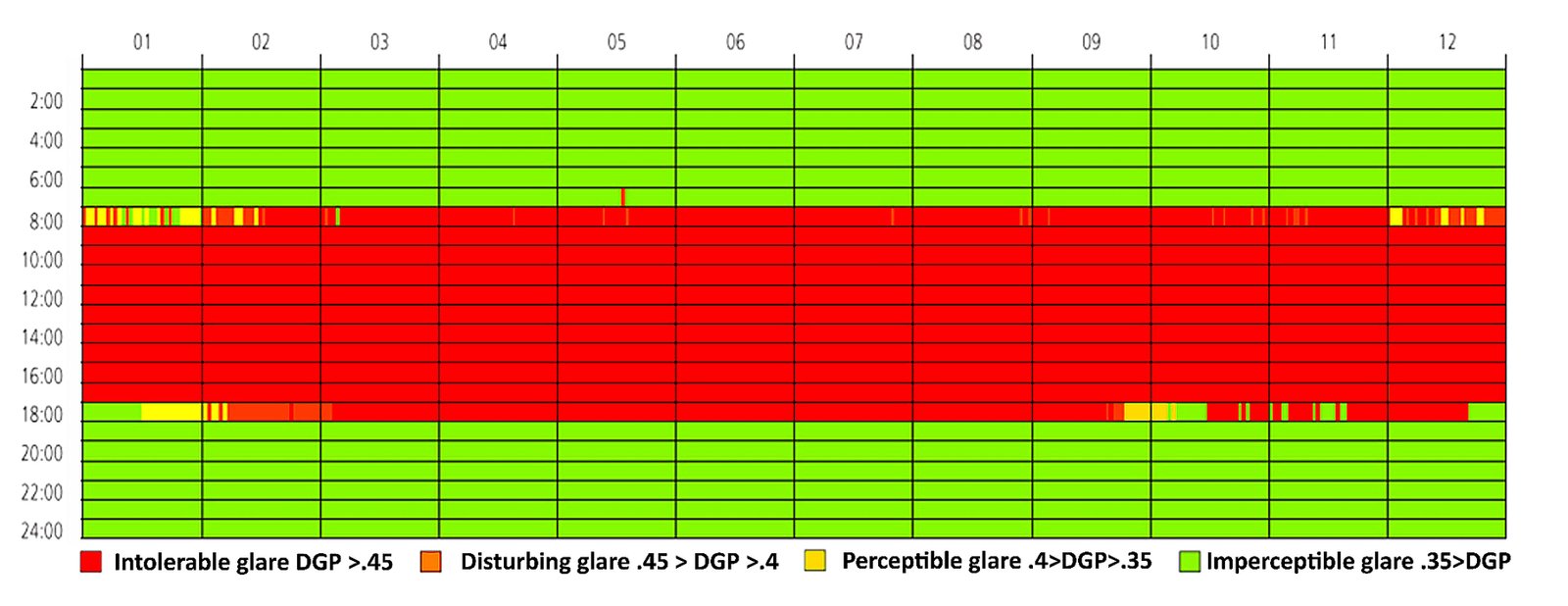 In the South-West Orientation (Fig. 10), intolerable glare (DGP 0.45) occurred from 8:00 am to 6:00 pm, accounting for about 60% to 70% of occupied hours annually. The highest glare levels were recorded between March and September, coinciding with periods of intense solar exposure. During early mornings and evenings, glare levels were moderate. Approximately 20% to 25% of the day experienced either disturbing glare (0.40 DGP 0.45) or perceptible glare (0.35 DGP 0.40). Consequently, less than 10% of the time was visually comfortable. These findings confirm that south-west orientations consistently cause glare problems, regardless of reflectance levels, making them the most significant for visual discomfort.