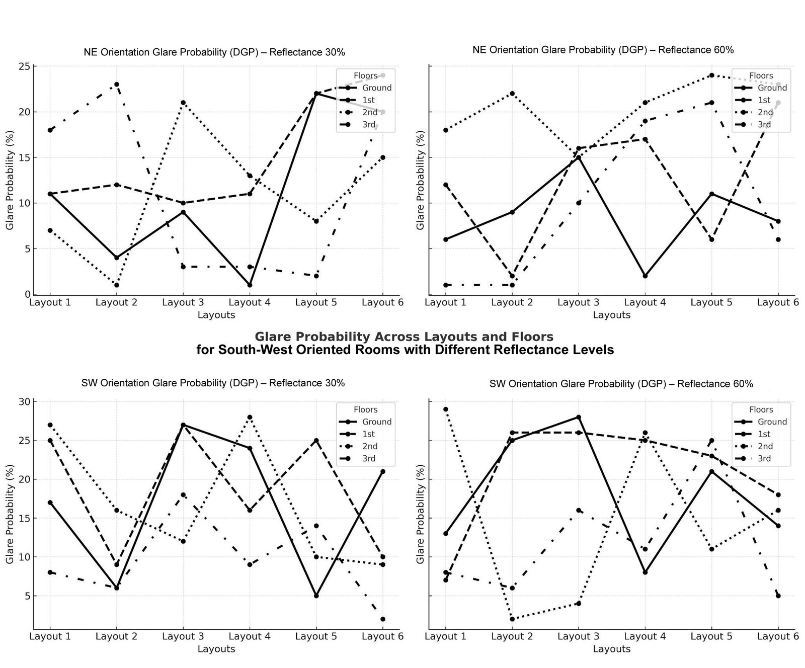 The façade reflectance intensifies the vertical distribution of glare across floors. When reflectance increases to 65%, mid-level floors experience a 250% increase in glare compared to 30% reflectance, despite adequate daylight levels (sDA 55–65%). This indicates that glare at intermediate levels is highly sensitive to surface reflectivity, with sufficient daylight overlapping the discomfort risk. On higher floors, glare is primarily caused by direct sunlight (DGP > 0.35), indicating that shading strategies are effective.