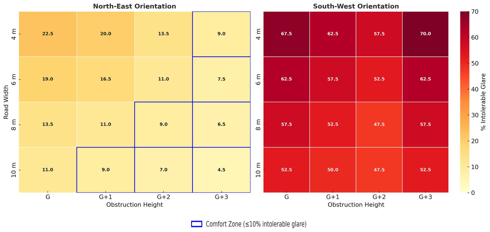 Results indicate that rooms in the northeast experience a significant reduction in glare as road widths increase. At higher floors, NE reaches acceptable glare levels (<10% intolerable glare) with a 10m street width. Conversely, southwest rooms remain highly susceptible to glare, with unacceptable levels consistently exceeding 45% to 70%, even at the same road widths and with lower obstructions. This emphasizes the need for adequate daylight in dense tropical urban areas. The heat map (Fig. 12) reveals unacceptable glare levels in northeast- and southwest-facing rooms, which are affected by various obstruction heights (G–G+3) and setback widths (4m to 10 m). Data show that northeast rooms generally stay within comfort thresholds, with intolerable glare below 15% at road widths of 8m to 10 meters and even under G+3 obstructions. Conversely, southwest-facing rooms consistently experience high glare, with values exceeding 40% to 70% across all obstruction scenarios, underscoring their vulnerability. The heatmap illustrates how orientation and urban form influence visual comfort. These findings highlight the importance of adopting orientation-specific adaptive daylighting strategies in tropical city environments.
