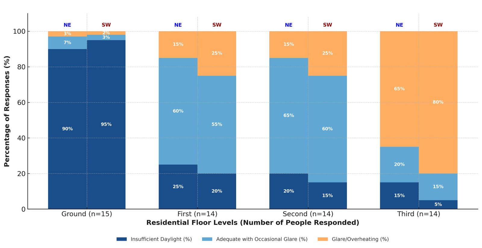 The occupant survey (Fig. 13) revealed clear differences between floor levels. Ground-floor residents (n = 15) mainly reported insufficient daylight (92%) due to obstructed sky views and limited natural light penetration. In contrast, third-floor occupants frequently reported glare and overheating, which aligns with their higher exposure to daylight. The middle floors had a more balanced perspective: residents on the first and second floors generally found conditions acceptable, although they occasionally experienced glare during peak sunlight hours.