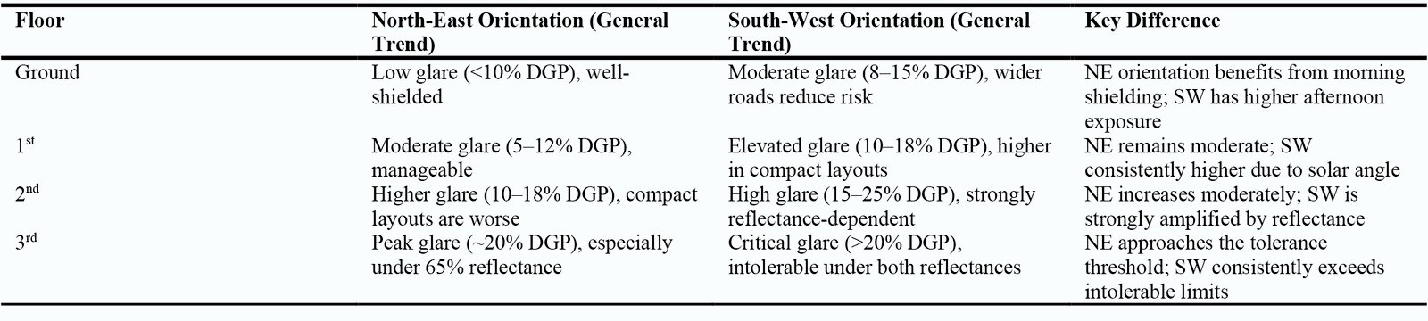 Table 2, reveals substantial daylighting differences between north-east and south-west orientations. North-east rooms strike a balance, providing adequate daylight with moderate glare, especially on upper floors. Conversely, south-west rooms experience persistent high glare levels, despite good daylight autonomy. This discomfort worsens on higher floors due to afternoon sunlight and nearby reflective surfaces. These insights indicate that NE orientations require strategies to balance daylight and glare. In contrast, SW orientations necessitate stronger glare-control measures, such as low-reflectance facades, external shading, and orientation-sensitive fenestration.