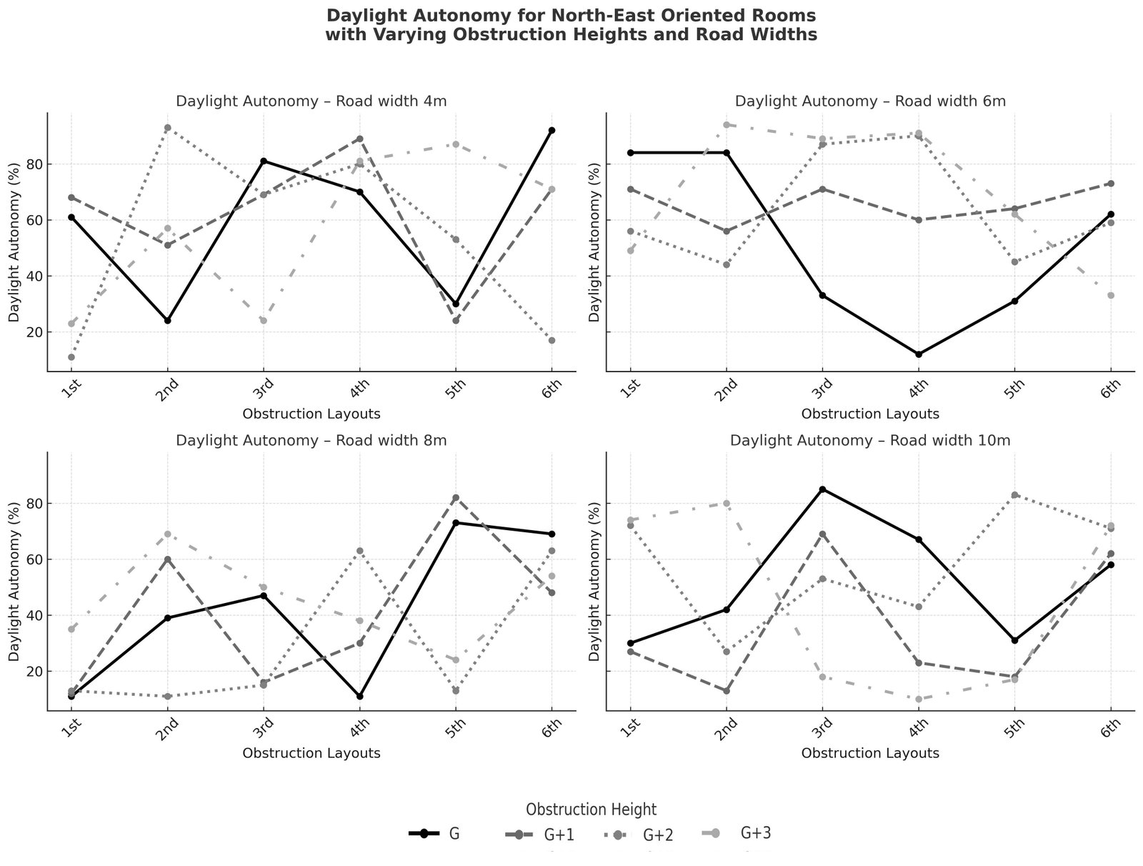Figure 4, illustrates how obstruction height (G, G+1, G+2, G+3 floors) and road width (4 m, 6 m, 8 m, 10 m) together influence daylight autonomy (DA) in rooms facing northeast. The comparison across the six layouts reveals clear differences in daylight performance. A narrow 4-meter-wide road with taller obstructions (G+2 or G+3) causes sDA values to drop below acceptable levels. This highlights how dense urban environments limit access to daylight. In contrast, layouts with wider road setbacks of 8 m or more tend to have more stable sDA values. Even when surrounded by taller obstructions, these layouts still achieve adequate daylight. This shows that increased urban spacing improves daylight access. In north-east-oriented layouts, numbers 1, 3, and 4 demonstrated higher daylight autonomy when obstructions were placed 8 m and 10 m from the building. Conversely, nearby obstructions caused a significant decrease in daylight on the ground, first, and second floors. Under these conditions, Layout 4 performed relatively better, while Layouts 5 and 7 consistently showed poor daylighting results across all tested scenarios.