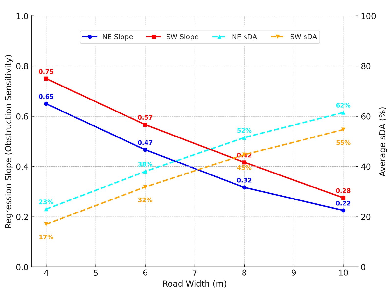 Figure 7, shows the relationship between obstruction sensitivity and sDA across different road widths and orientations (NE and SW). Figure 7, indicates that obstruction height has the most significant impact on narrow roads (4 m wide), where steep slopes result in very low sDA values (<30% to 35%). As the road width increases, the slopes become gentler, reducing the impact of obstruction height. Consequently, sDA values improve, with NE layouts reaching approximately 65% to 80% and SW layouts around 55% to 70% at a 10 m width.