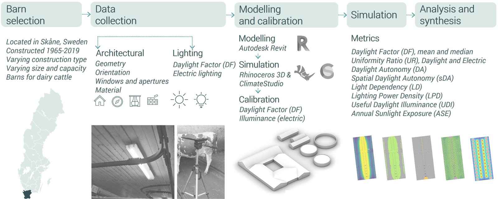 Fig. 1. The overall methodology of the study about daylighting and electric lighting in ten dairy barns of Southern Sweden: barn selection, data collection, modelling and calibration, simulation, analysis, and synthesis.