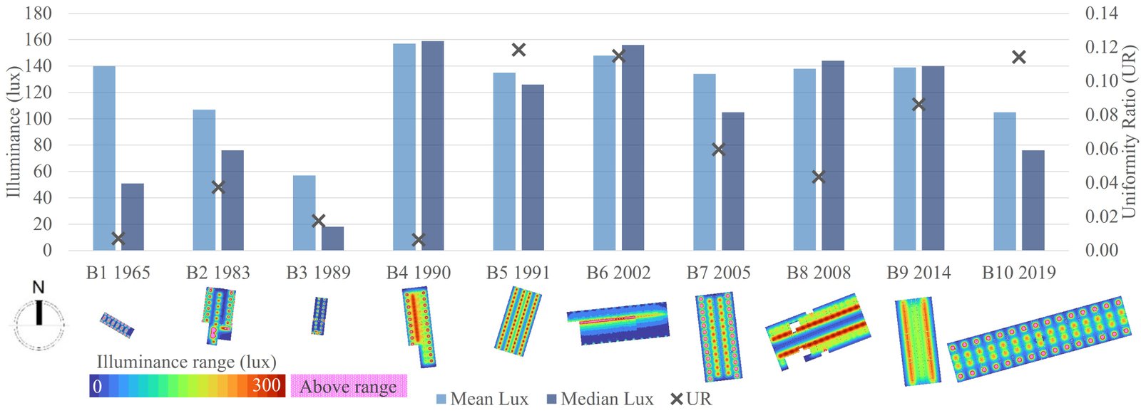 Fig. 11. Comparison of electric lighting conditions in the barns. The bar chart shows the simulated mean and median illuminance (lux) for each barn. The axis on the right indicates the uniformity ratio (UR). A corresponding illuminance distribution map visually represents the spatial lighting conditions within each barn. North is upwards in all plans.