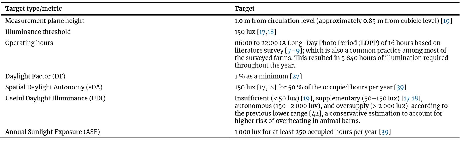 Table 1. Summary of lighting performance metrics, thresholds, and conditions applied in the analysis.