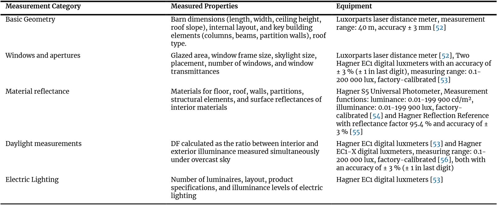 Data collected at each visit and the equipment used for the measurements are listed in Table 3. The daylight measurements were performed only under an overcast sky, as DF was the only daylight metric measured on site [37] (Fig. 1). The measurements were collected during daytime between 09:00 and 15:00 hours and thus, photometric measurements focused on daylighting. The architectural drawings of the barns were collected from the farmers for eight out of the ten barns to produce the simulation models. Physical measurements were used alongside satellite images to create the simulation models in the absence of a floor plan for the other two barns (B2 and B6). The roof slope, type, and overhang dimensions were noted. All daylight apertures through windows, doors, and skylights were measured. Window-to-wall ratio (WWR) is suitable for typical buildings where daylight openings are limited to glazed wall surfaces, but it is less appropriate for dairy barns which commonly include skylights, large doors, and often with materials other than glass. Moreover, in dairy barns the total wall area is often comparable to, and in some cases even exceeded by, the total aperture area. Instead, floor area provides a more reliable reference parameter. Therefore, this study introduces the Aperture-to-Floor Ratio (AFR) for a more reliable analysis. AFR was calculated by Eq. (5) to understand the degree to which it impacted daylighting performance in the barns when compared with the daylight metrics.
