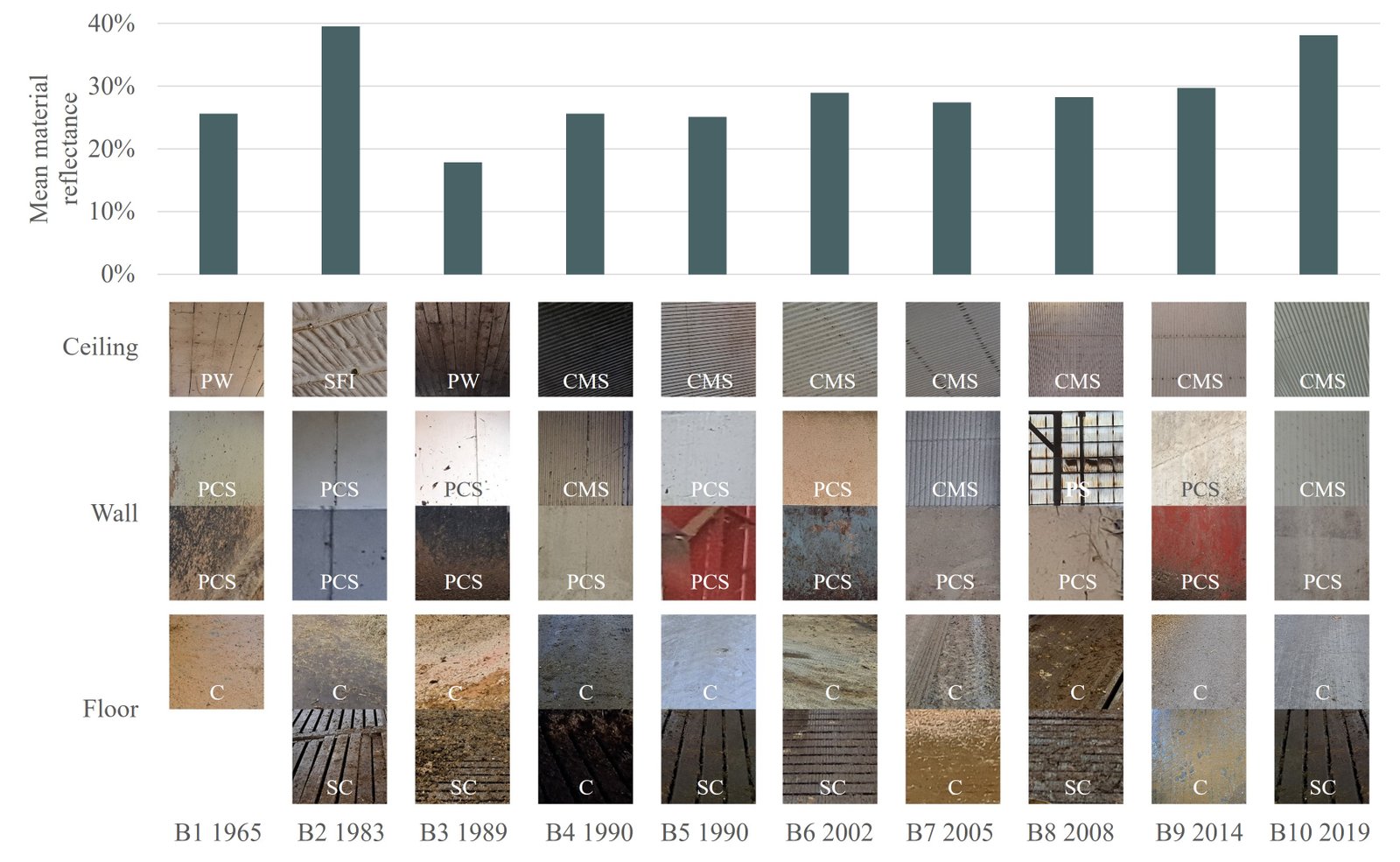 The area-weighted average material reflectance of the major interior building materials is presented in Fig. 8 along with a pictorial representation. The image indicates a preference for lighter-coloured materials in more recent constructions. Older barns often have darker-coloured materials and higher soiling levels, which reduce interreflections. The use of more metal and concrete was also observed in recent barns. A gradual rise of higher mean material reflectance can be observed in Fig. 8 throughout the years, except for barn B2 built in 1983. This farm has higher mean material reflectance compared to its contemporaries, which possibly caused a higher illuminance, partially owing to a white sprayed foam insulation on corrugated metal roof. Corrugated metal roofs have been a dominant roofing material in recent years; however, they are carbon-intensive and can cause overheating issues if not insulated. Lower parts of the walls are often painted in a darker colour for maintenance reasons, while upper parts are painted in lighter colours. Many recent barns also used corrugated metal and polycarbonate sheets in upper parts of the walls. Flooring materials often have very low material reflectance, due to soiling and cattle manure. Building materials can become very dirty; therefore, luminaires cannot perform as they should because of low material reflectance.