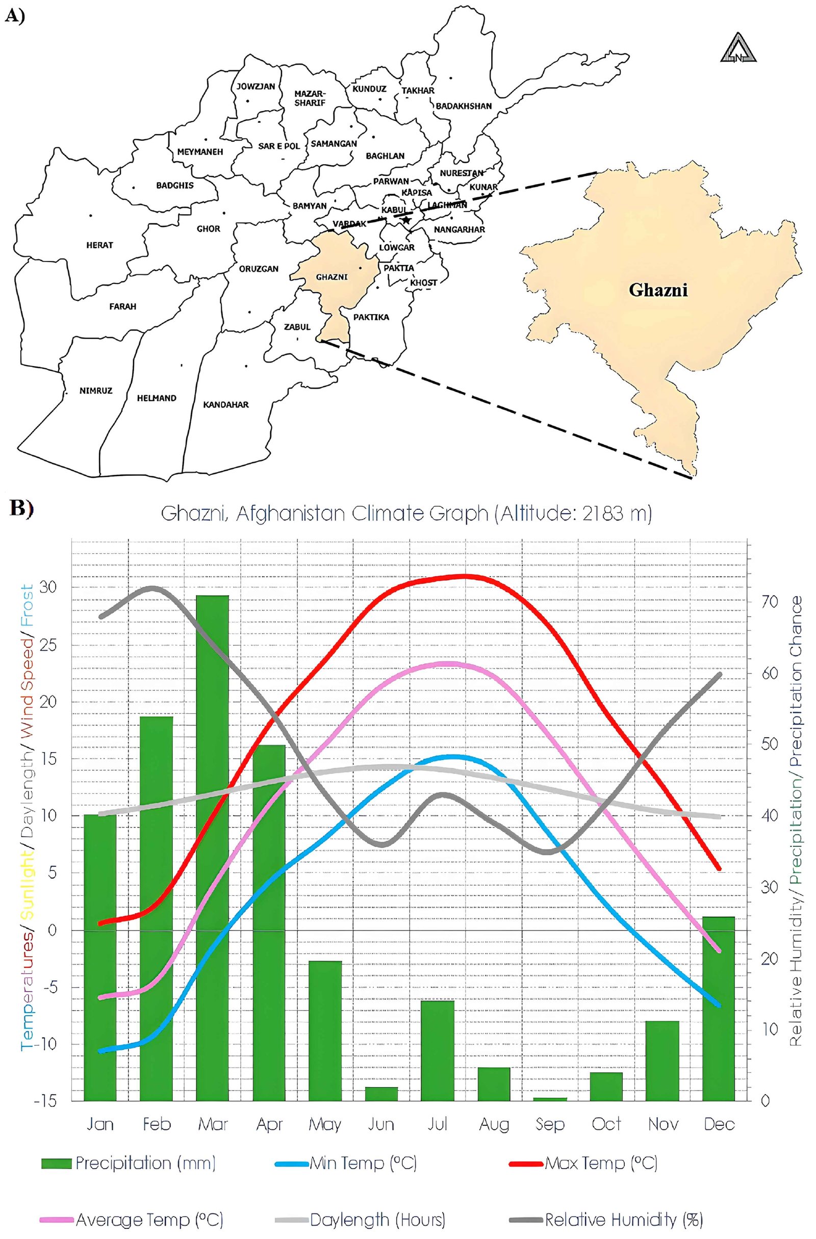Fig. 1. Study location and Climatic data. (A) Map showing the location of Ghazni Province in AFG (Source: Authors). (B) Climatic data for Ghazni, including temperature, precipitation, daylength, and relative humidity (Source: [44]).