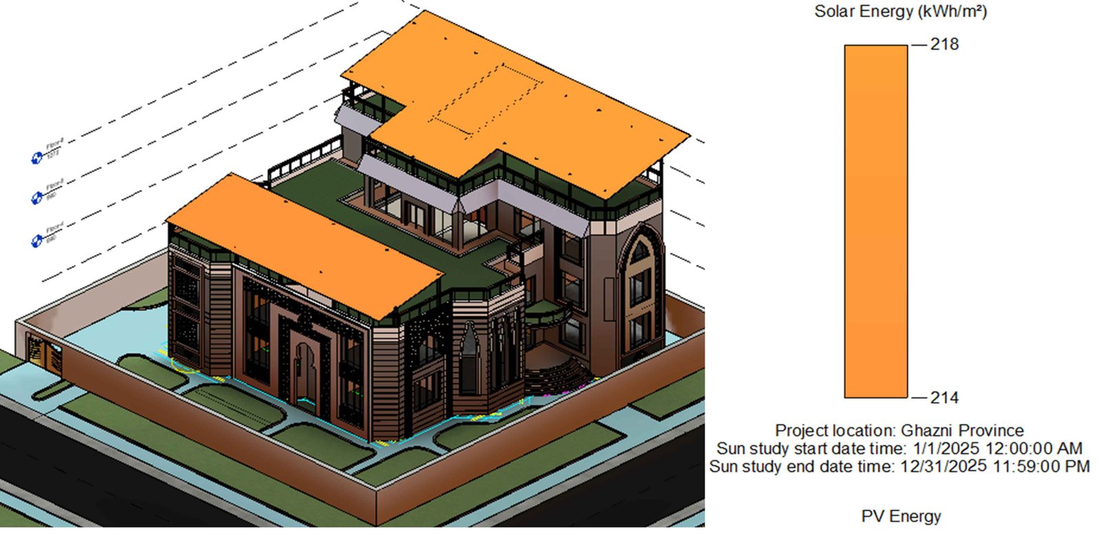 Fig. 10. Annual solar radiation and PV energy potential at the project site in Ghazni Province, indicating conditions favorable for NZEB performance.
