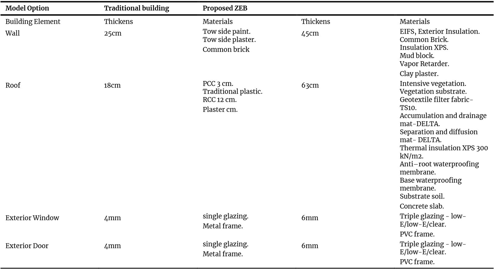 Table 1. Building element specifications for the traditional and proposed models used in the energy simulation.