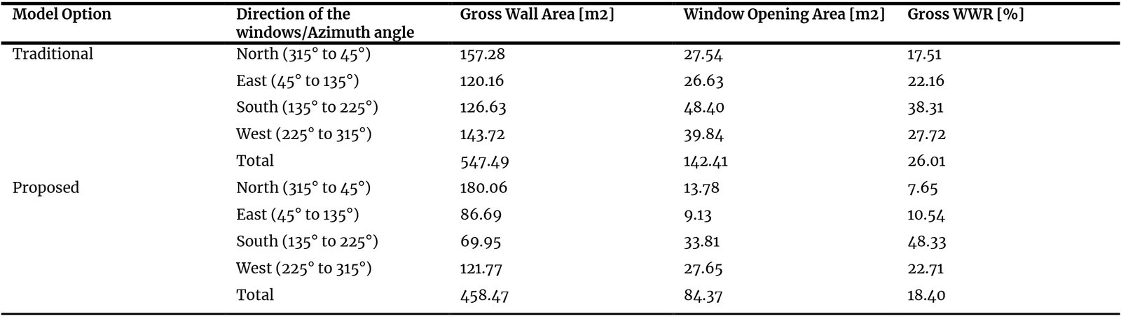 A critical focus of the parametric analysis was the optimization of the building envelope, particularly the WWR. The proposed model demonstrates a strategic and climatically responsive design compared to the traditional model. Overall, the total window area was reduced by 40.76 (from 142.41 m to 84.37 m ), and the Gross WWR was lowered from 26.01 to 18.40 , a reduction of 29.26 . More importantly, the proposed design strategically rebalances this ratio per orientation. For instance, it drastically reduces the East facade WWR from 22.16 to 10.54 to minimize morning heat gain, while strategically maintaining a high South facade WWR of 48.33 to maximize beneficial solar heat gain in winter (Table 2).